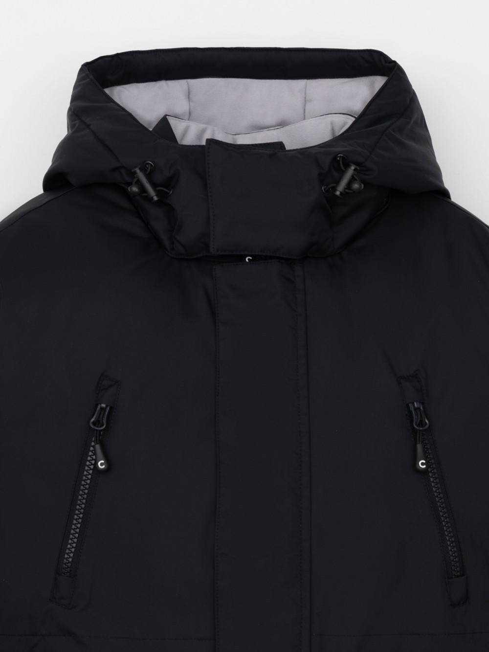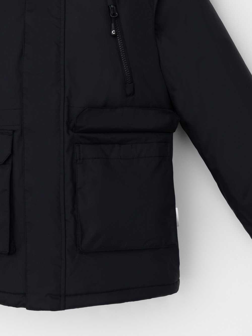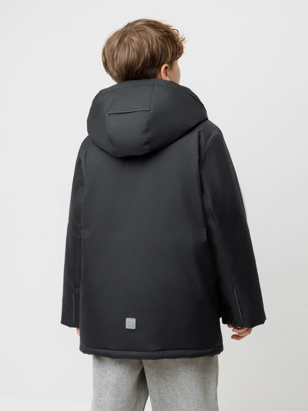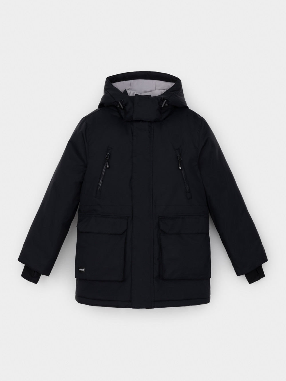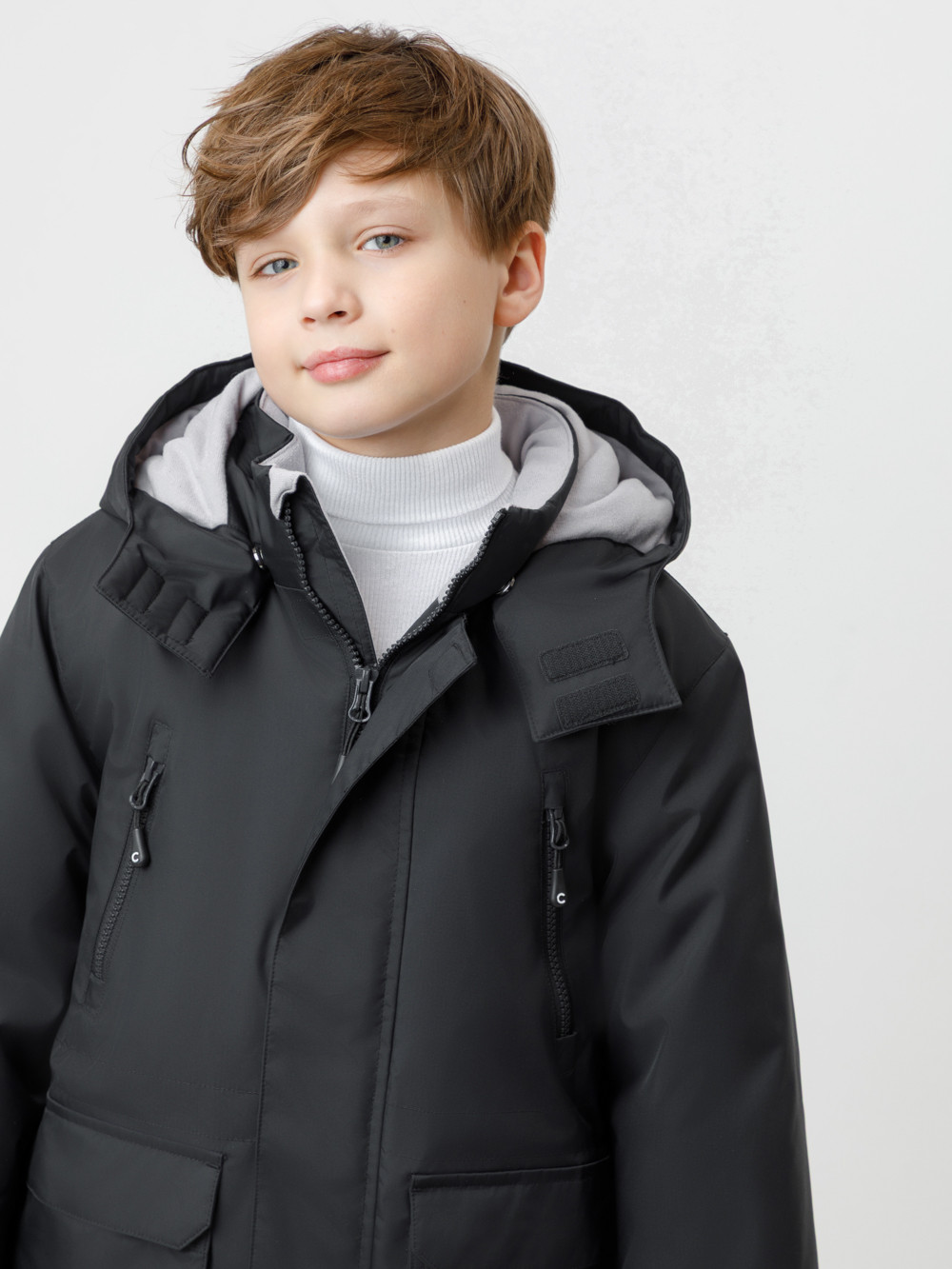 Зимняя куртка для мальчика с утеплителем  SEE®: 250 г/м2. Выполнена из мембранной ткани с дополнительной тефлоновой обработкой, которая предохраняет изделие от загрязнений и отталкивает влагу. Подклад выполнен из 100% полиэстера Tricot. Куртка застёгивается на молнию и внешнюю планку с магнитными кнопками, предусмотрена защита подбородка. Съёмный капюшон на кнопках и липучках имеет эластичную утяжку со стопперами. На рукавах внутренние эластичные манжеты. Два накладных кармана с клапанами по бокам и два кармана с молниями на груди. По талии эластичная утяжка со стопперами. Во всех изделиях верхнего ассортимента для безопасности ребёнка предусмотрены светоотражающие элементы.