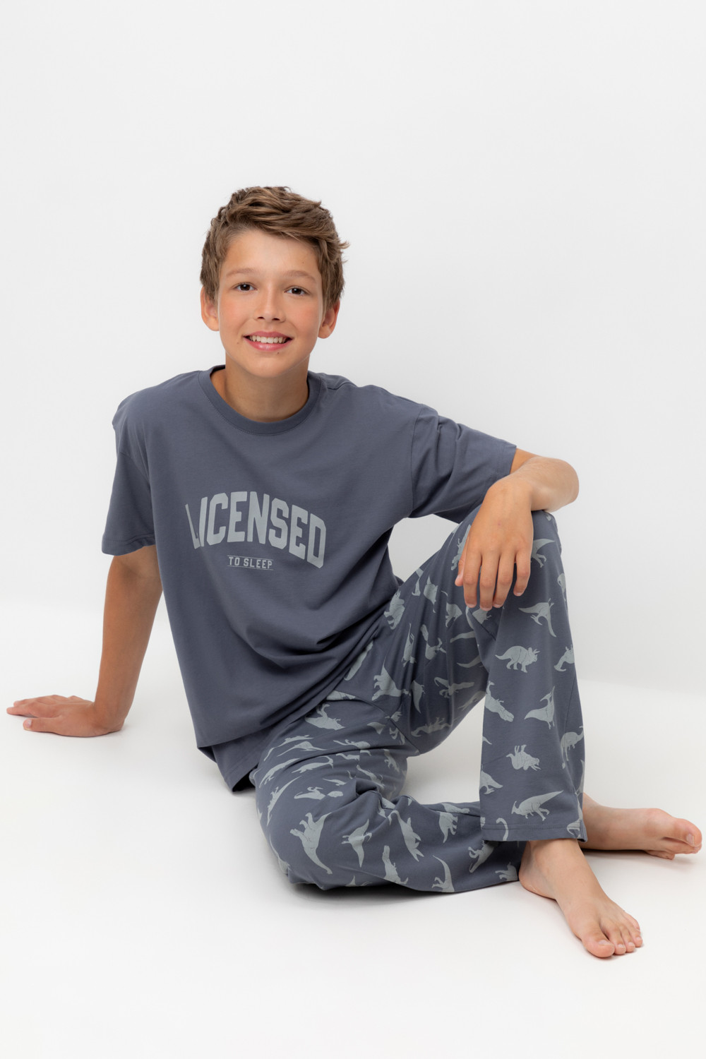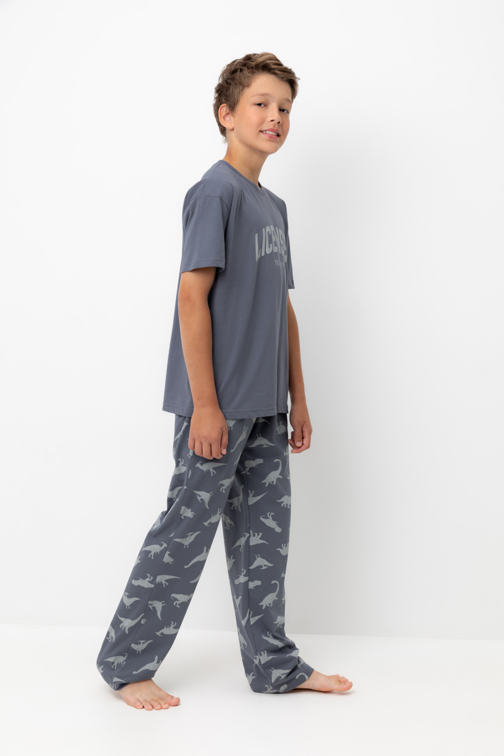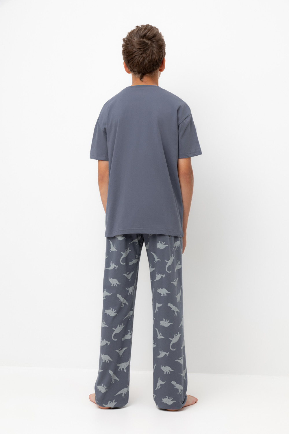 Трикотажный пижамный комплект из натурального хлопка. У футболки короткие рукава. Брюки с удобным поясом на резинке и утягивающим плетеным шнуром. Оригинальная набивка и принт выполнены из стойких, гипоаллергенных текстильных красителей. Все трикотажные полотна производятся в соответствии с нормами Швейцарского сертификата ЭкоТекс.