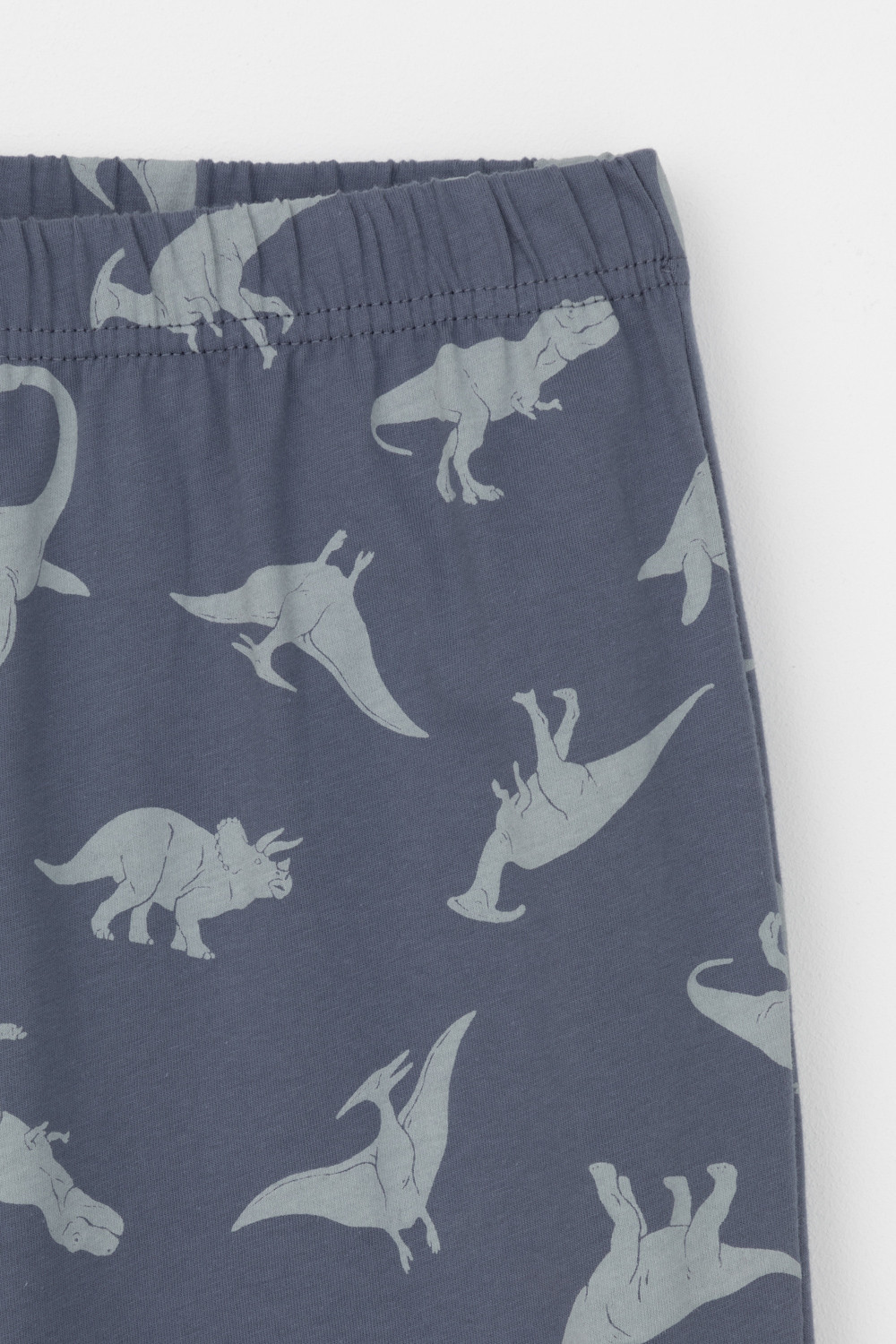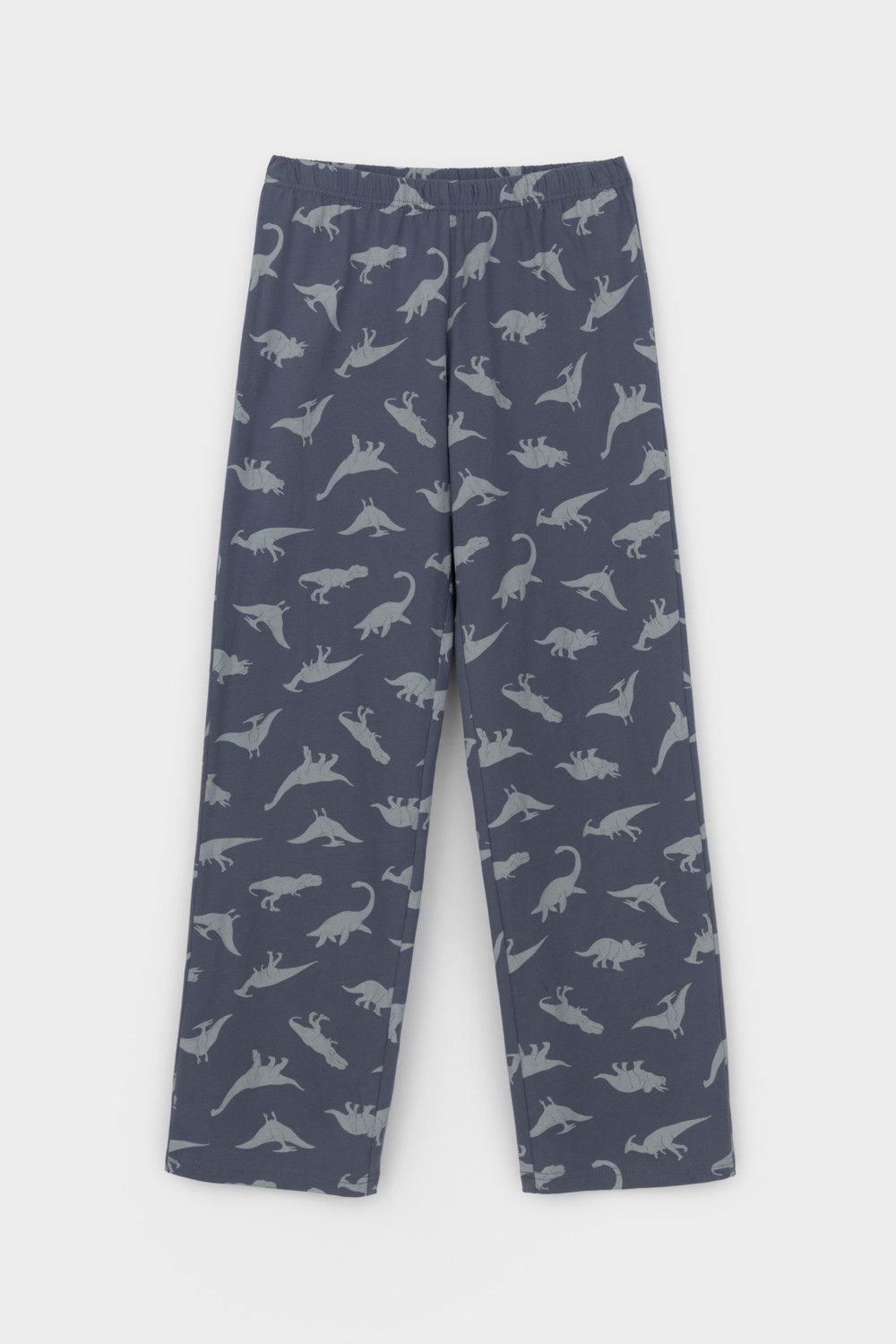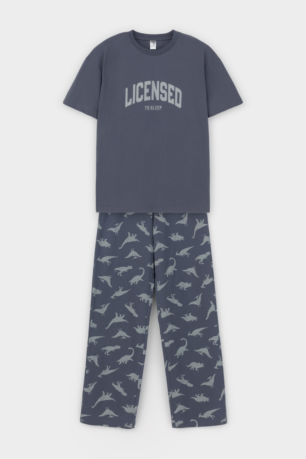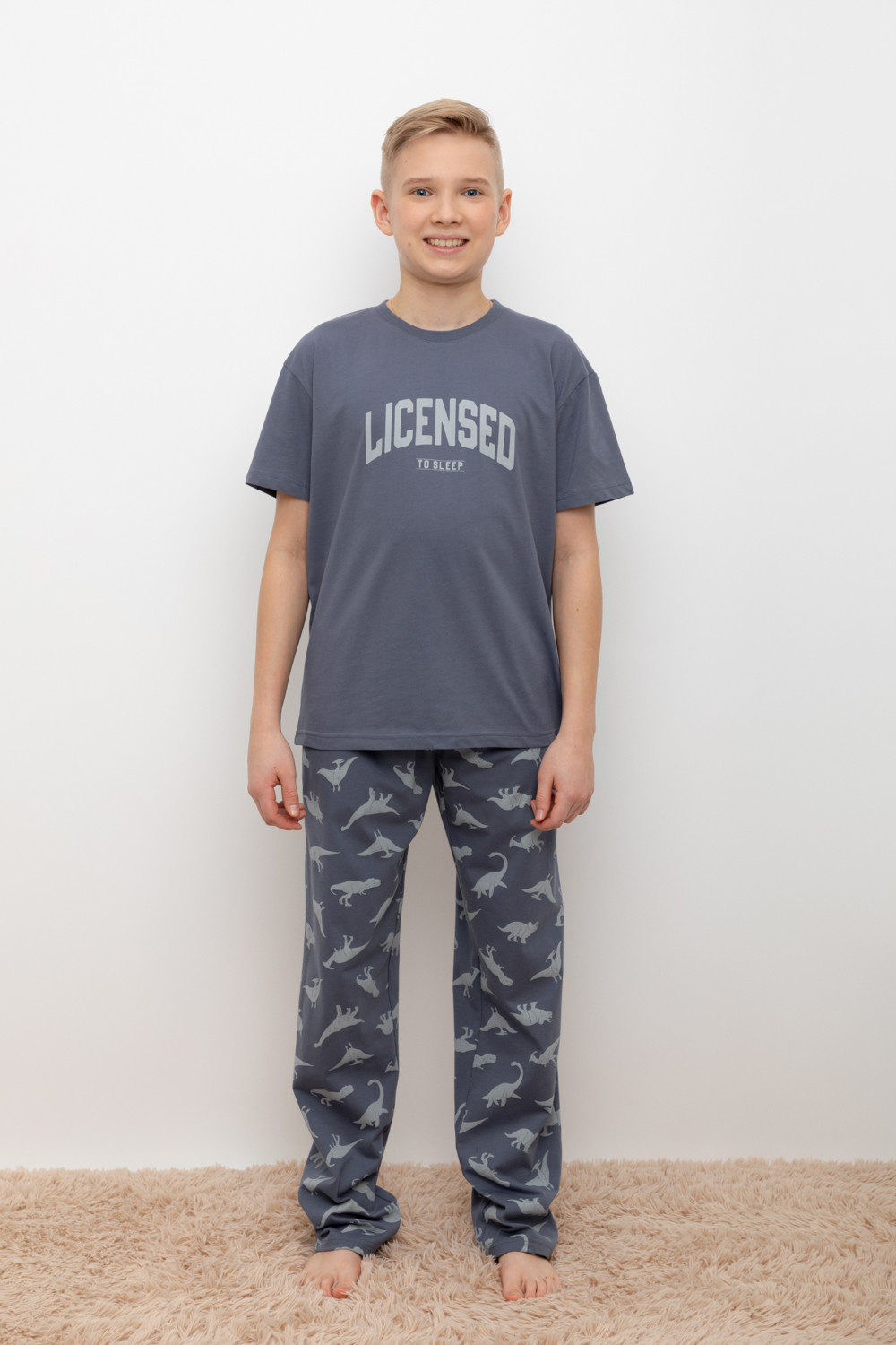 Трикотажный пижамный комплект из натурального хлопка. У футболки короткие рукава. Брюки с удобным поясом на резинке и утягивающим плетеным шнуром. Оригинальная набивка и принт выполнены из стойких, гипоаллергенных текстильных красителей. Все трикотажные полотна производятся в соответствии с нормами Швейцарского сертификата ЭкоТекс.