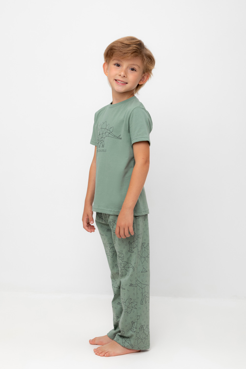 Трикотажная пижама из натурального хлопка.  Футболка с короткими рукавами с принтом. У брюк эластичный пояс на резинке. Оригинальные принт и набивка выполнены из стойких, гипоаллергенных текстильных красителей. Пижама сохраняет цвет и форму после многократных стирок. Все трикотажные полотна производятся в соответсвии с нормами Швейцарского сертификата ЭкоТекс.