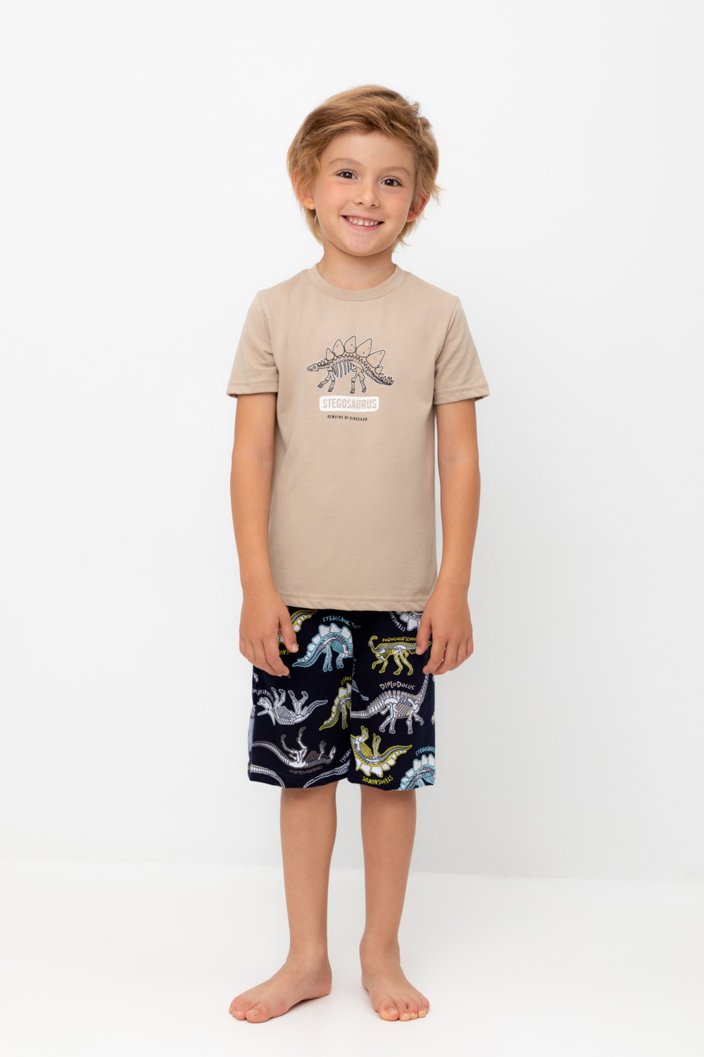 Трикотажная пижама из натурального хлопка. Футболка с короткими рукавами с принтом . У шорт эластичный пояс на резинке. Оригинальная набивка выполнена из стойких, гипоаллергенных текстильных красителей. Пижама сохраняет цвет и форму после многократных стирок. Все трикотажные полотна производятся в соответсвии с нормами Швейцарского сертификата ЭкоТекс.