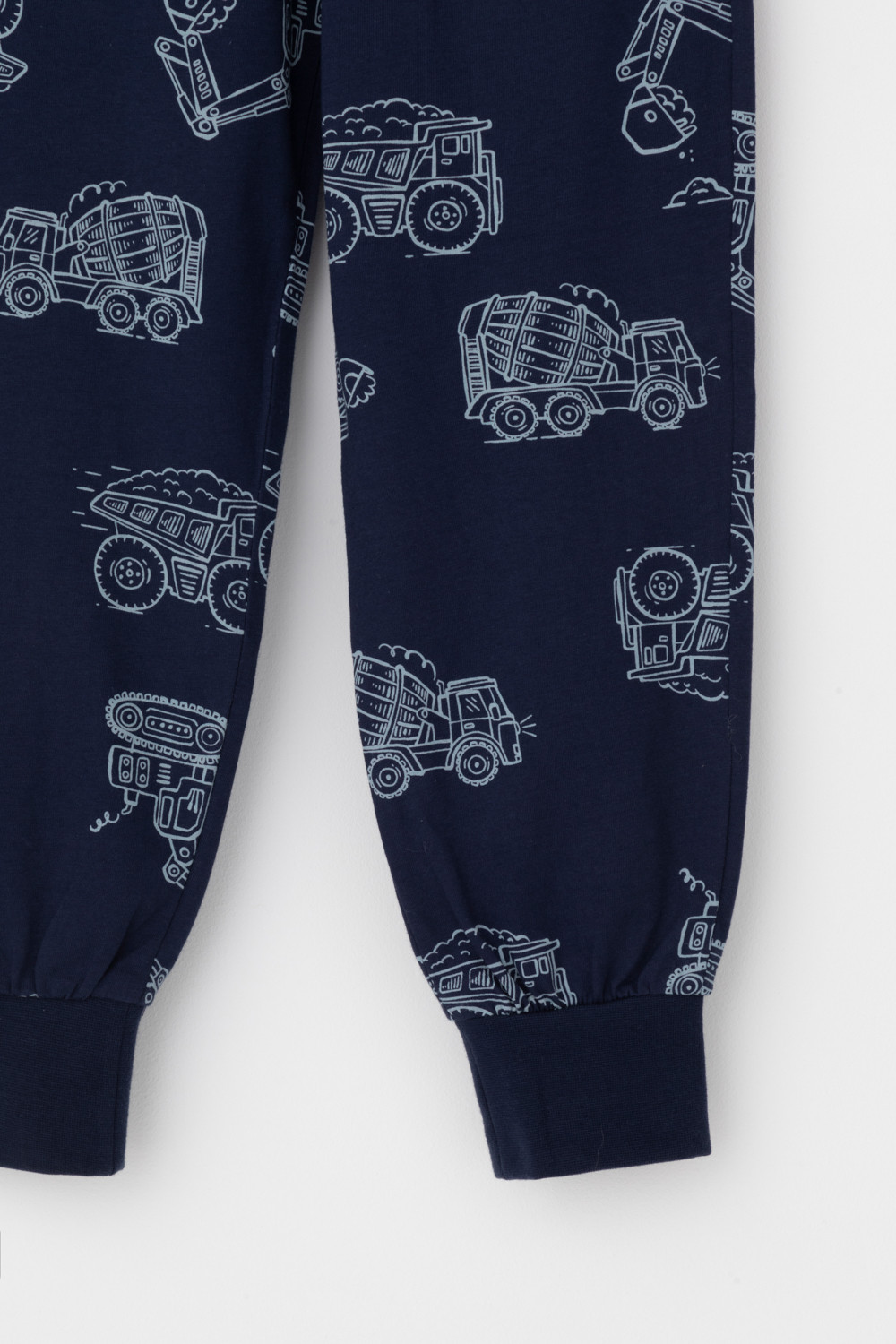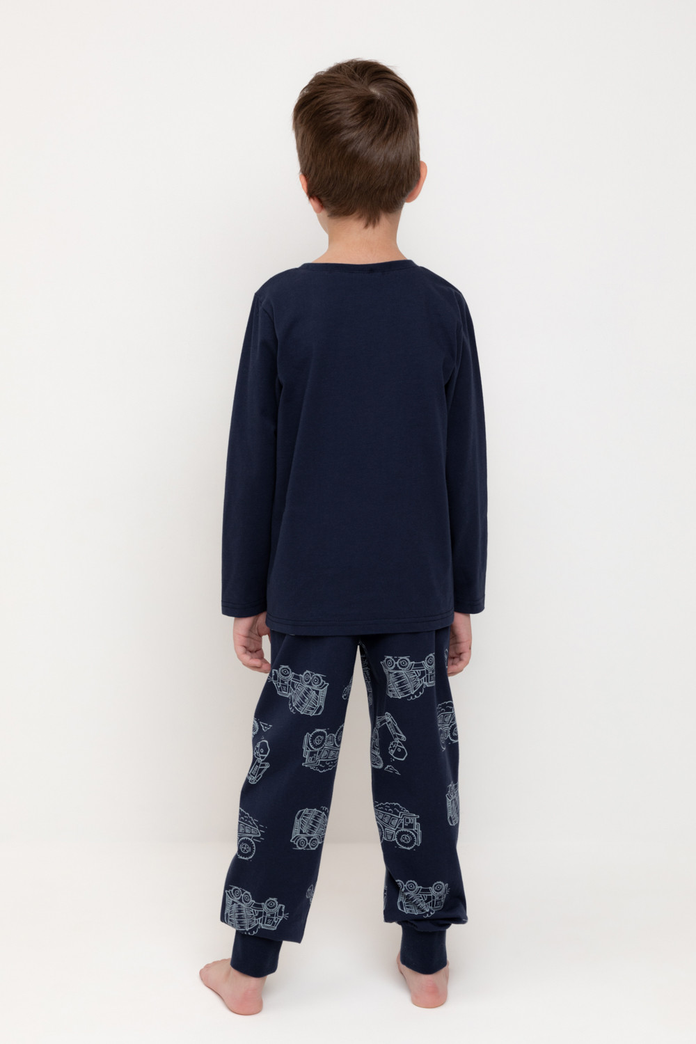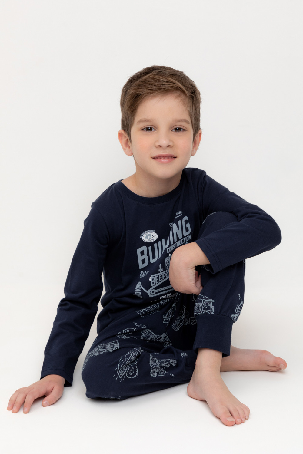 Пижама для мальчика из натурального хлопка. Джемпер с длинными втачными рукавами и брюки с эластичной резинкой в поясе. Мягкие манжеты по низу брюк сделаны из материала в рубчик. Оригинальная набивка и принт выполнены из стойких текстильных гипоаллергенных красителей. Изделие сохраняет цвет и форму после многократных стирок. Все трикотажные полотна производятся в соответствии с нормами швейцарского сертификата ЭкоТекс.