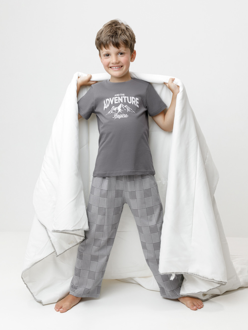 Трикотажная пижама из натурального хлопка. Футболка с короткими втачными рукавами и прямые брюки с эластичной резинкой в поясе. Оригинальные набивка и принт выполнены из стойких гипоаллергенных текстильных гипоаллергенных красителей. Изделие сохраняет цвет и форму после многократных стирок. Все трикотажные полотна производятся в соответсвии с нормами швейцарского сертификата ЭкоТекс.