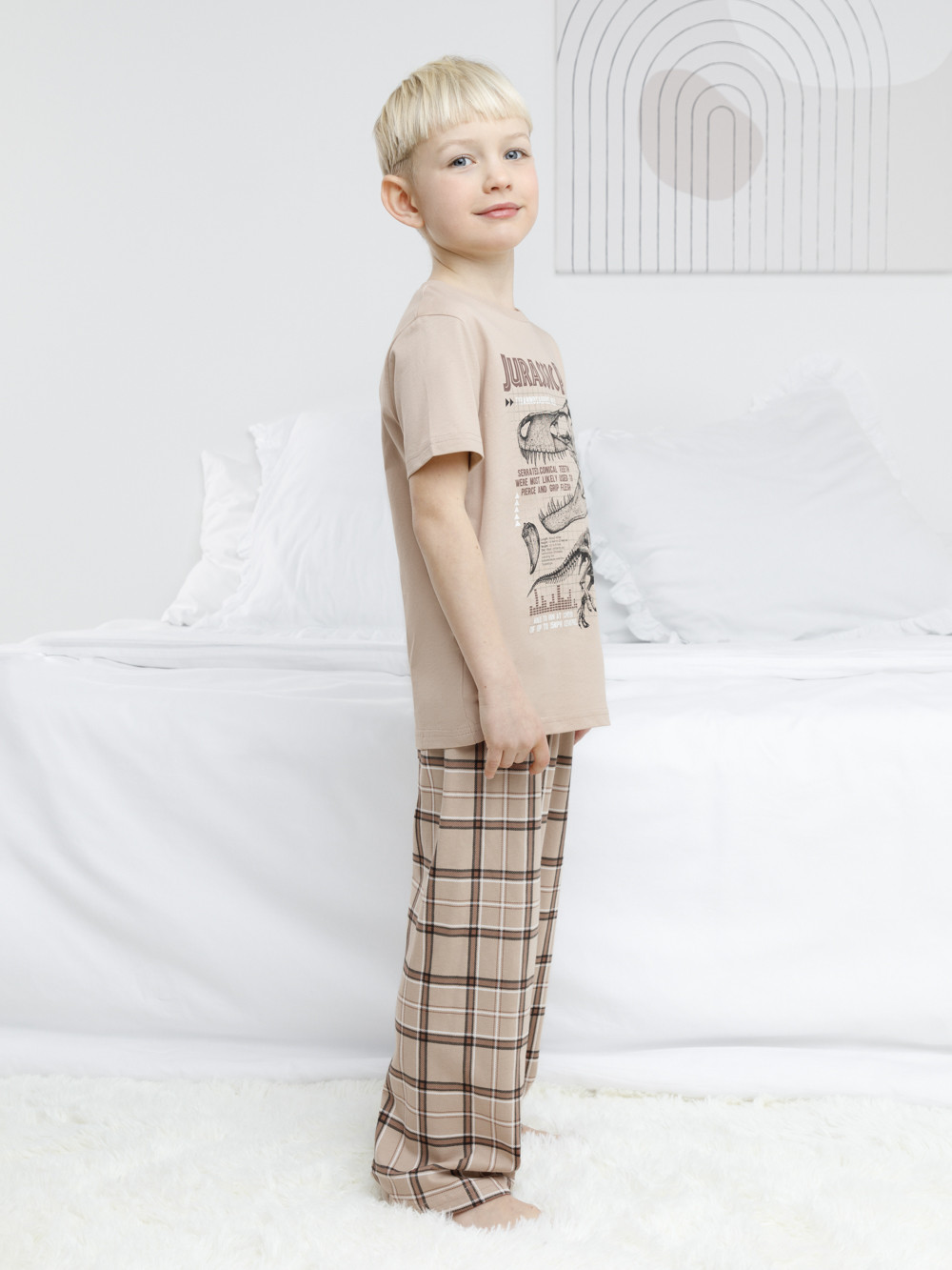 Трикотажная пижама из натурального хлопка. Футболка с короткими втачными рукавами и прямые брюки с эластичной резинкой в поясе. Оригинальные набивка и принт выполнены из стойких гипоаллергенных текстильных красителей. Изделие сохраняет цвет и форму после многократных стирок. Все трикотажные полотна производятся в соответсвии с нормами швейцарского сертификата ЭкоТекс.