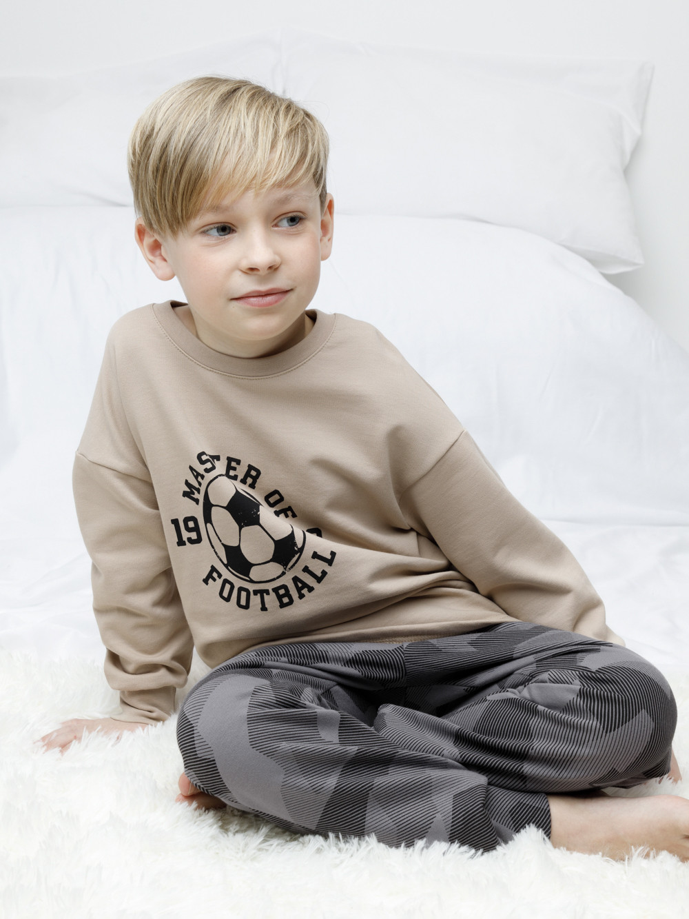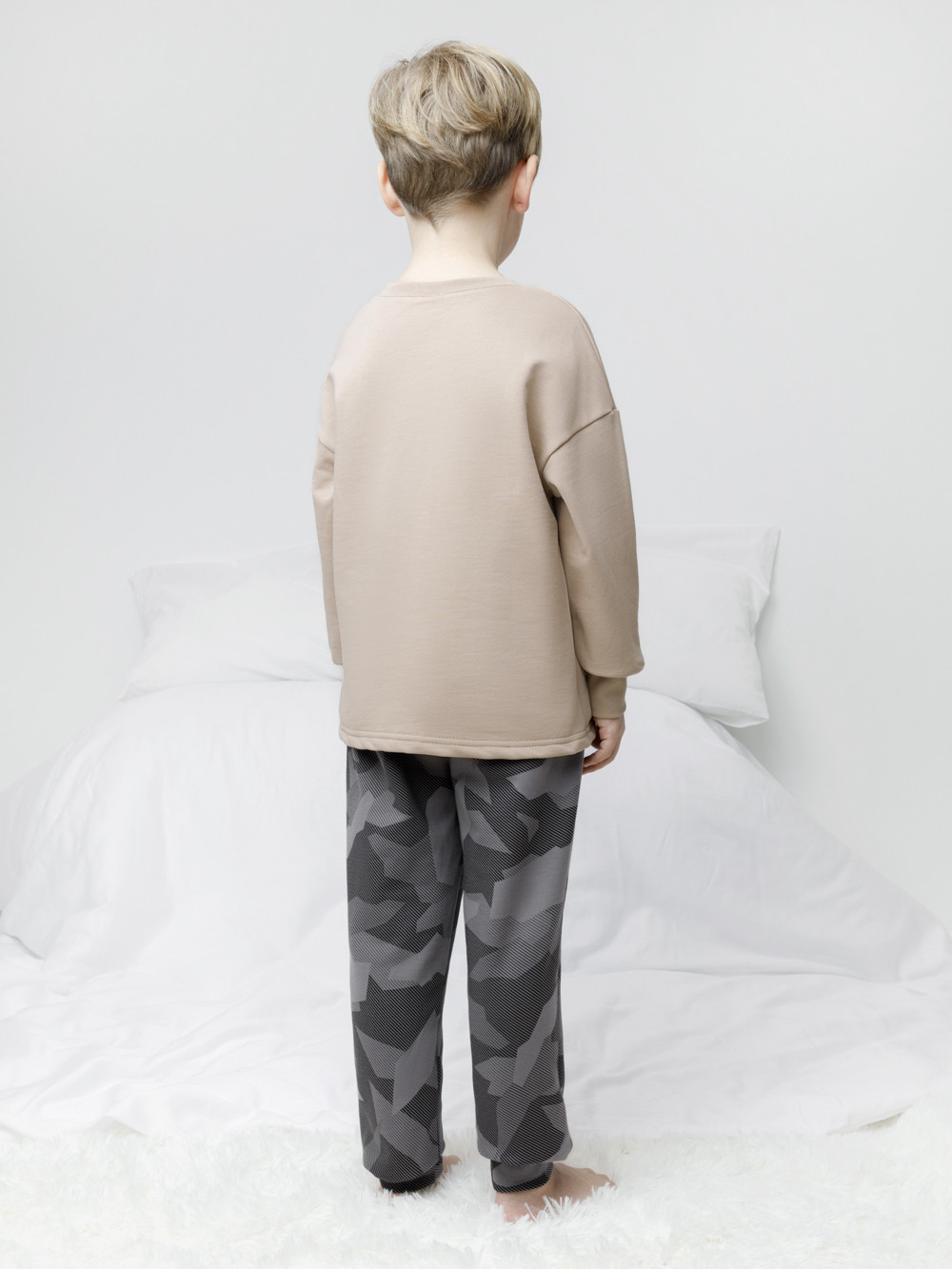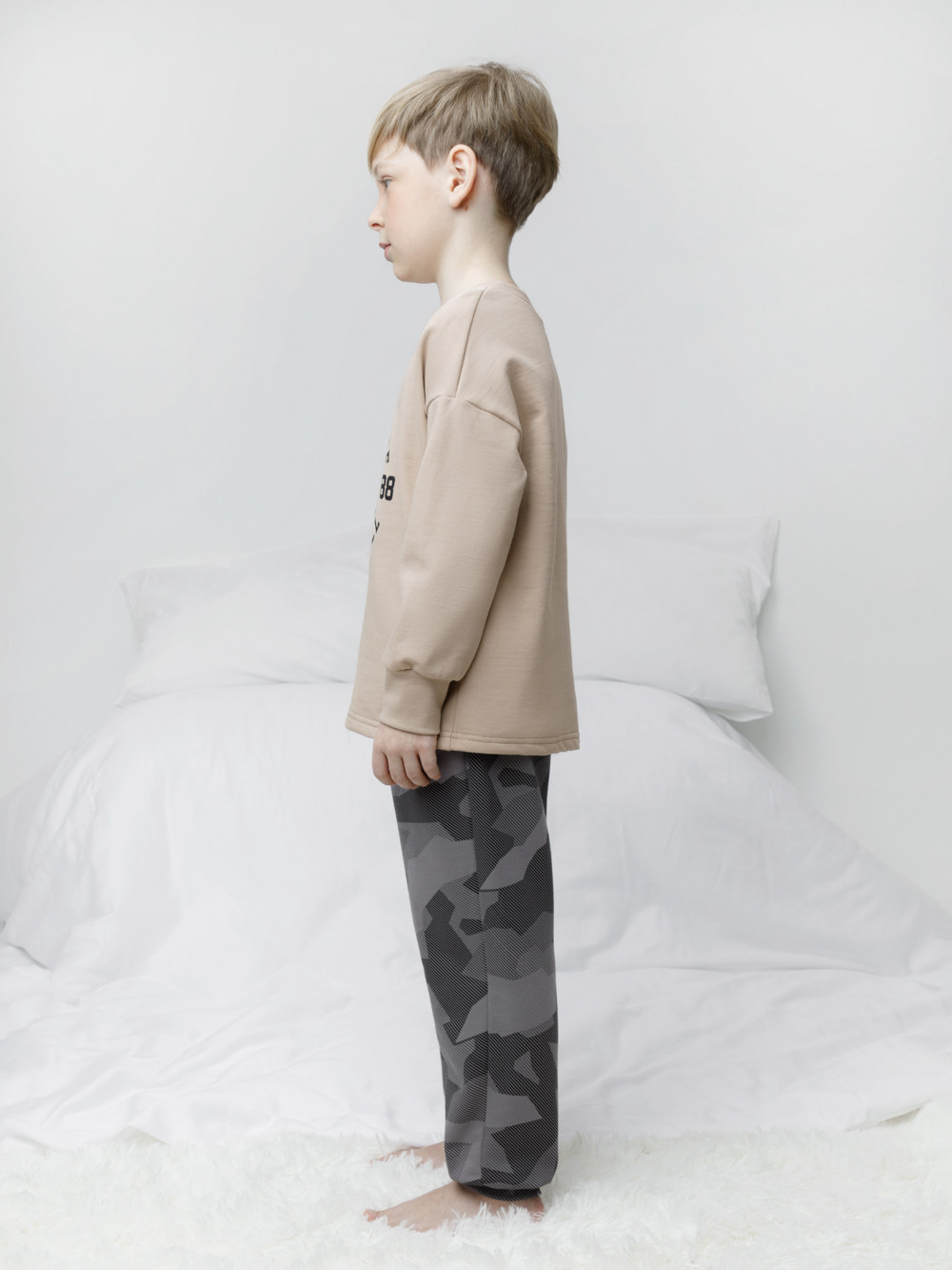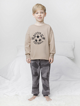 Тёплая пижама с начёсом из натурального хлопка. Джемпер с длинными спущенными рукавами и брюки с эластичной резинкой в поясе. Мягкие манжеты на рукавах и по низу брюк. Оригинальные набивка и принт выполнены из стойких гипоаллергенных текстильных красителей. Изделие сохраняет цвет и форму после многократных стирок. Все трикотажные полотна производятся в соответствии с нормами швейцарского сертификата ЭкоТекс.