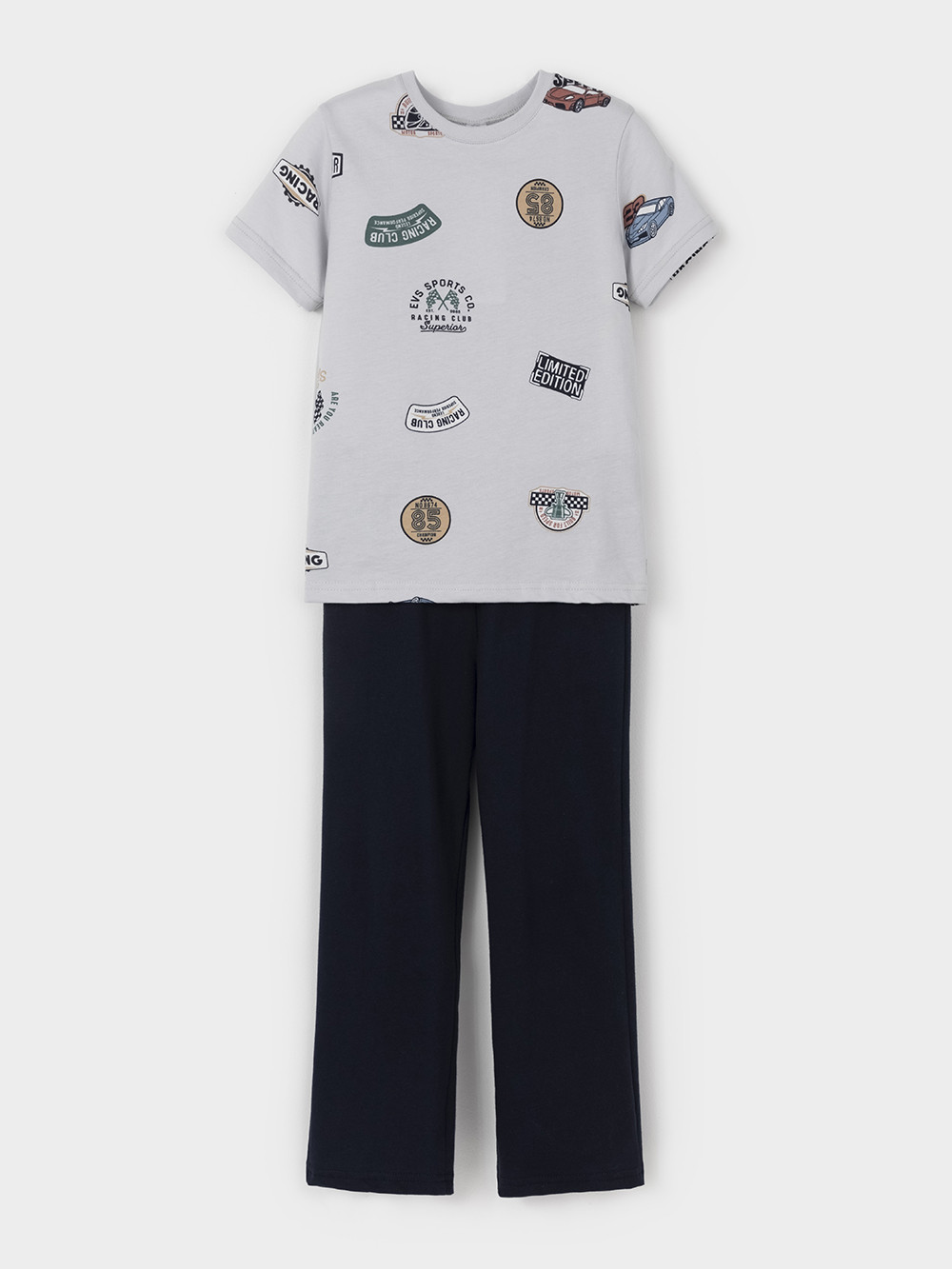 Пижама для мальчика из натурального хлопка. Футболка с короткими втачными рукавами и прямые брюки с эластичной резинкой в поясе. Оригинальная набивка выполнена из стойких текстильных гипоаллергенных красителей. Изделие сохраняет цвет и форму после многократных стирок. Все трикотажные полотна производятся в соответствии с нормами швейцарского сертификата ЭкоТекс.