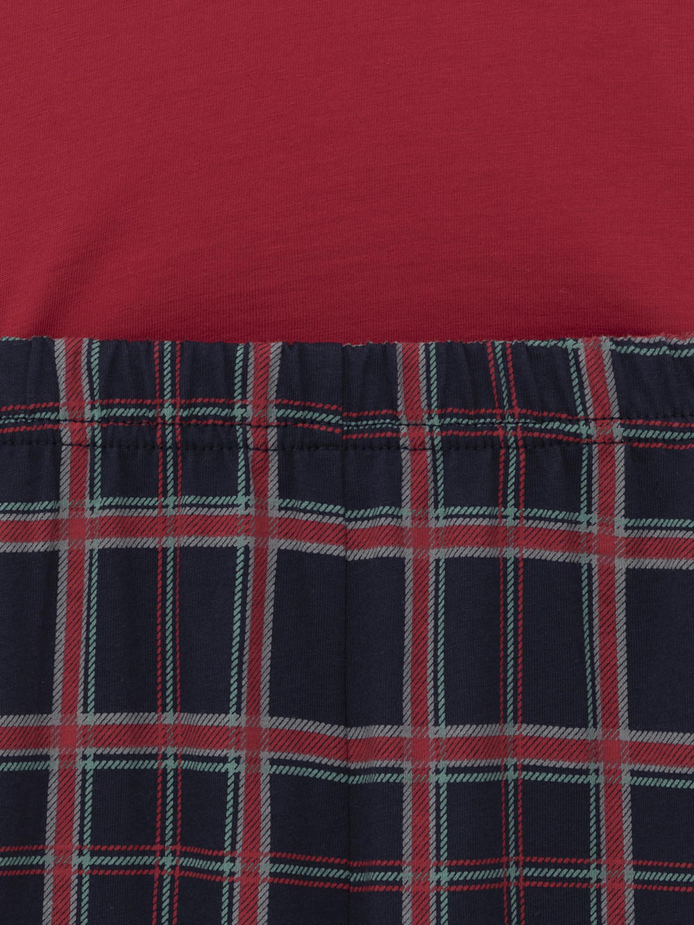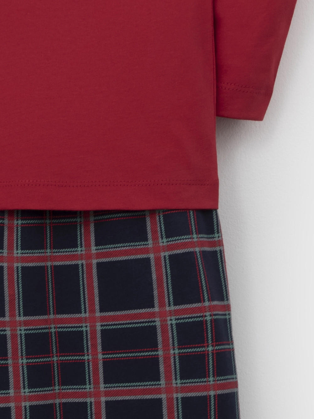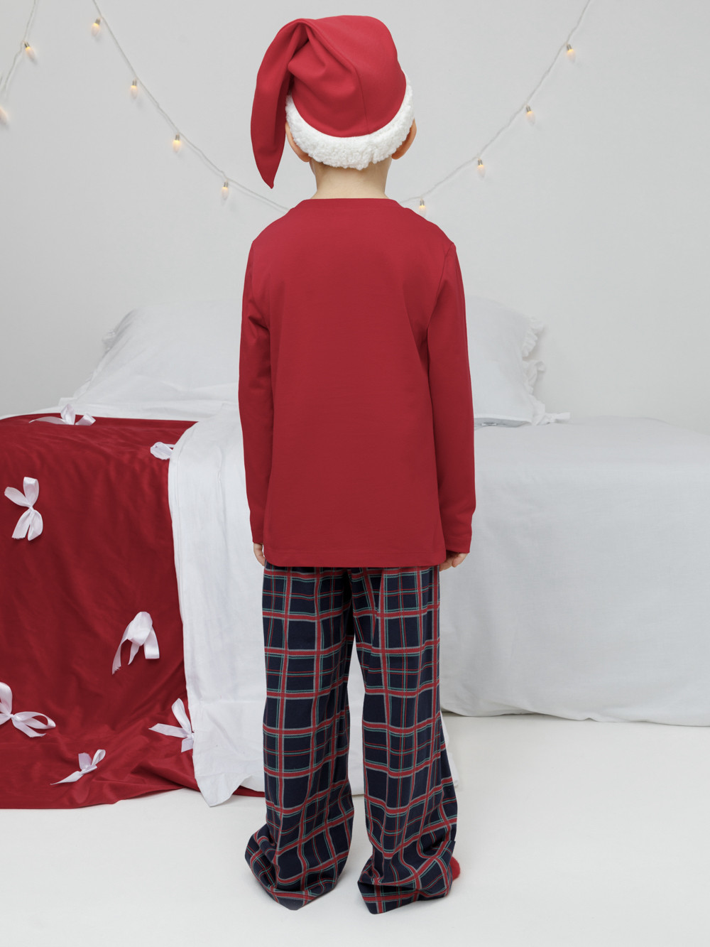 Новогодняя пижама из натурального хлопка для мальчика.  Джемпер с длинными втачными рукавами и прямые брюки с эластичной резинкой в поясе. Пижама отлично подойдёт для создания уютных домашних образов или в качестве подарка на Новый год и Рождество. Оригинальная набивка и принт выполнены из стойких текстильных гипоаллергенных красителей. Изделие сохраняет цвет и форму после многократных стирок. Все трикотажные полотна производятся в соответствии с нормами швейцарского сертификата ЭкоТекс.