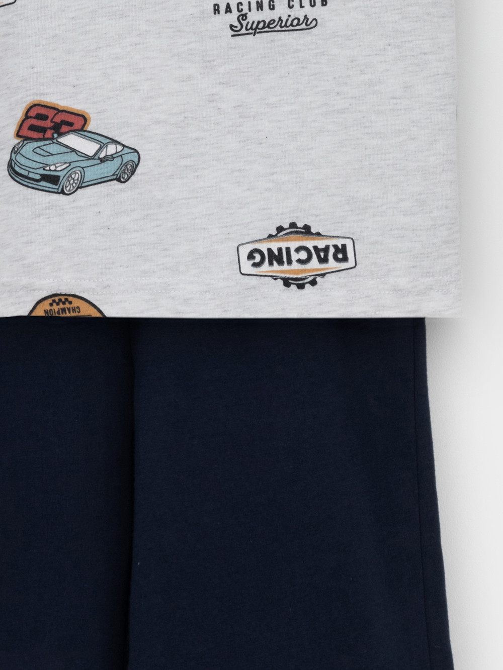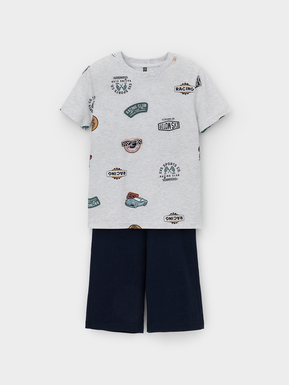 Пижама для мальчика из натурального хлопка. Футболка с короткими втачными рукавами и шорты с эластичной резинкой в поясе. Оригинальная набивка выполнена из стойких текстильных гипоаллергенных красителей. Изделие сохраняет цвет и форму после многократных стирок. Все трикотажные полотна производятся в соответствии с нормами швейцарского сертификата ЭкоТекс.