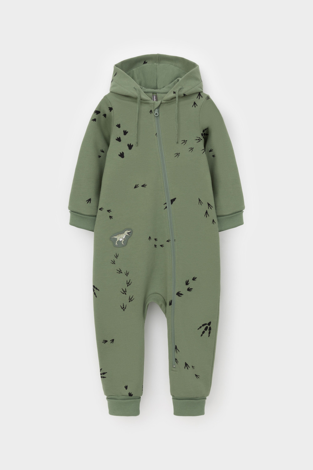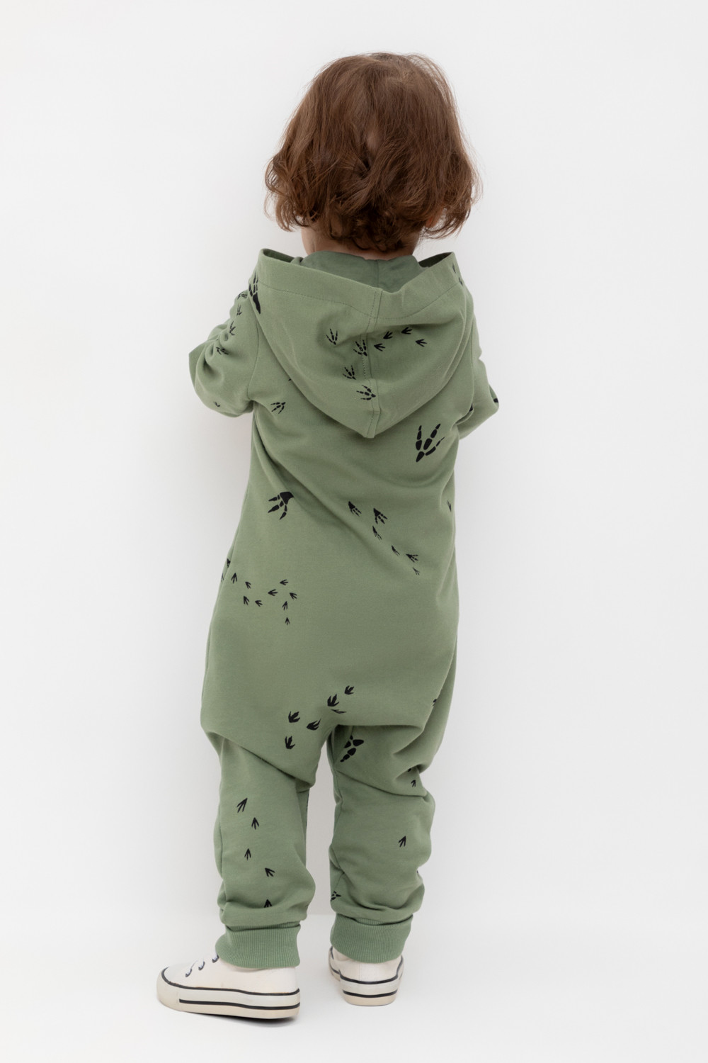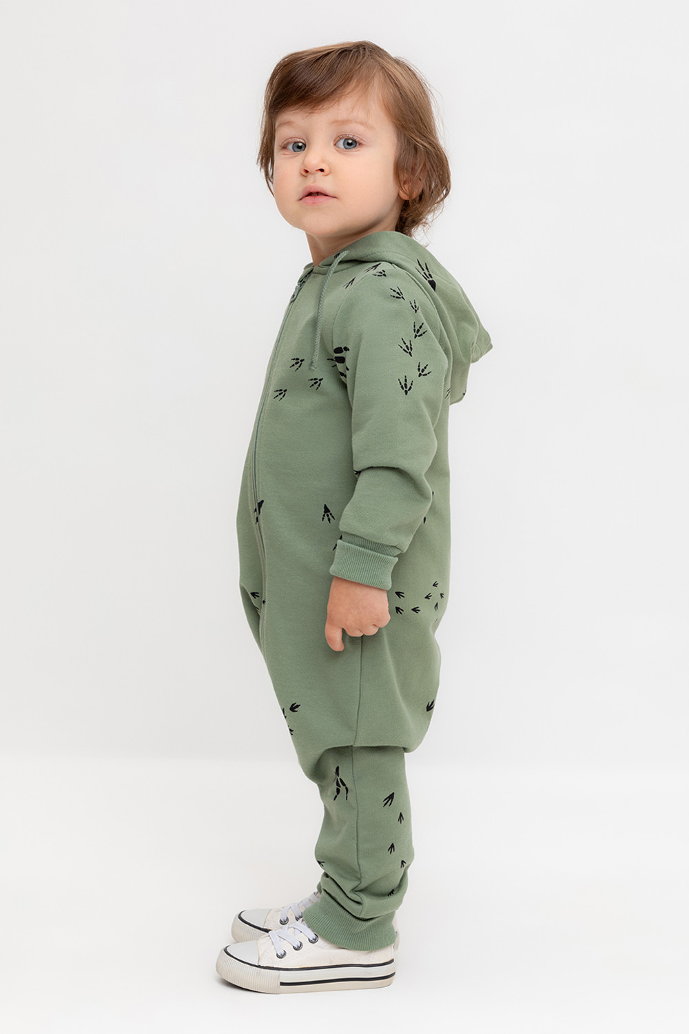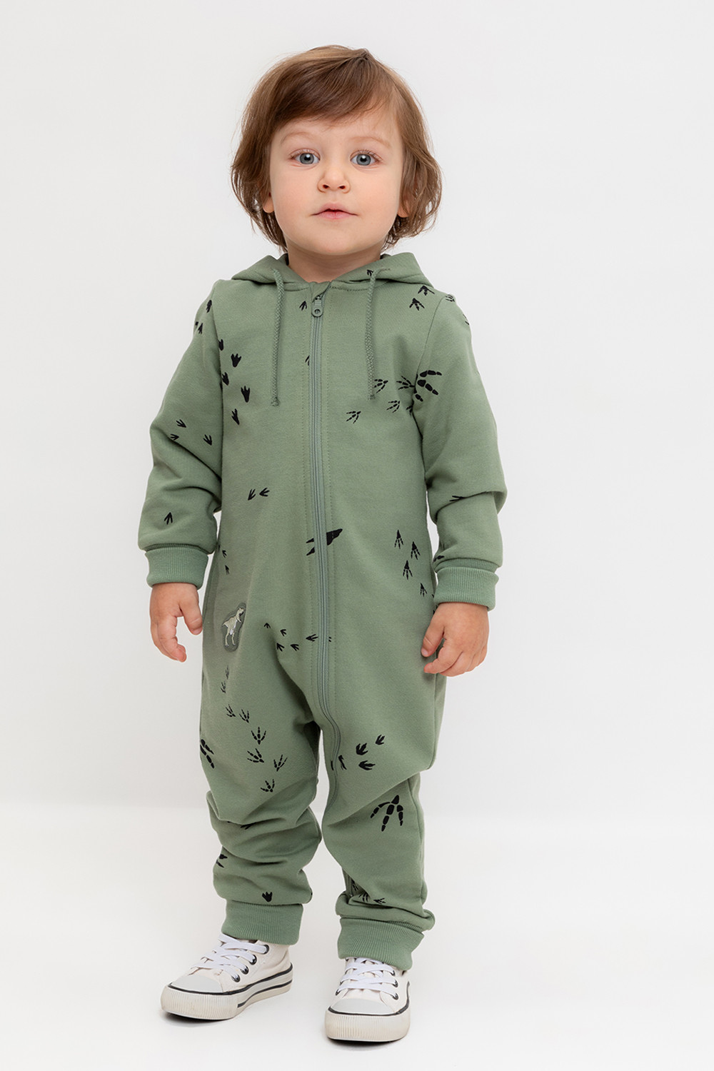 Комбинезон с капюшоном детский из мягкого петельчатого футера.  Манжеты выполнены их эластичного трикотажа в рубчик. Застёжка на молнию с защитой шеи и подбородка. Оригинальная набивка выполнена из стойких текстильных гипоаллергенных красителей.