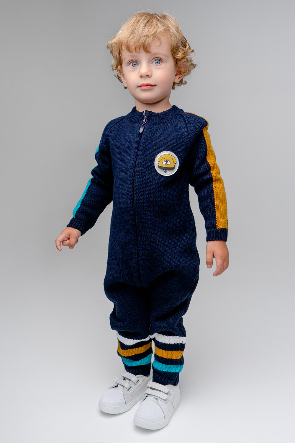Теплый вязанный комбинезон из полушерстяной пряжи в состав которой входит шерсть австралийского мериноса. У изделия рукава-реглан, связанные ластиком горловина и манжеты. Предусмотрена защита шеи и подбородка.