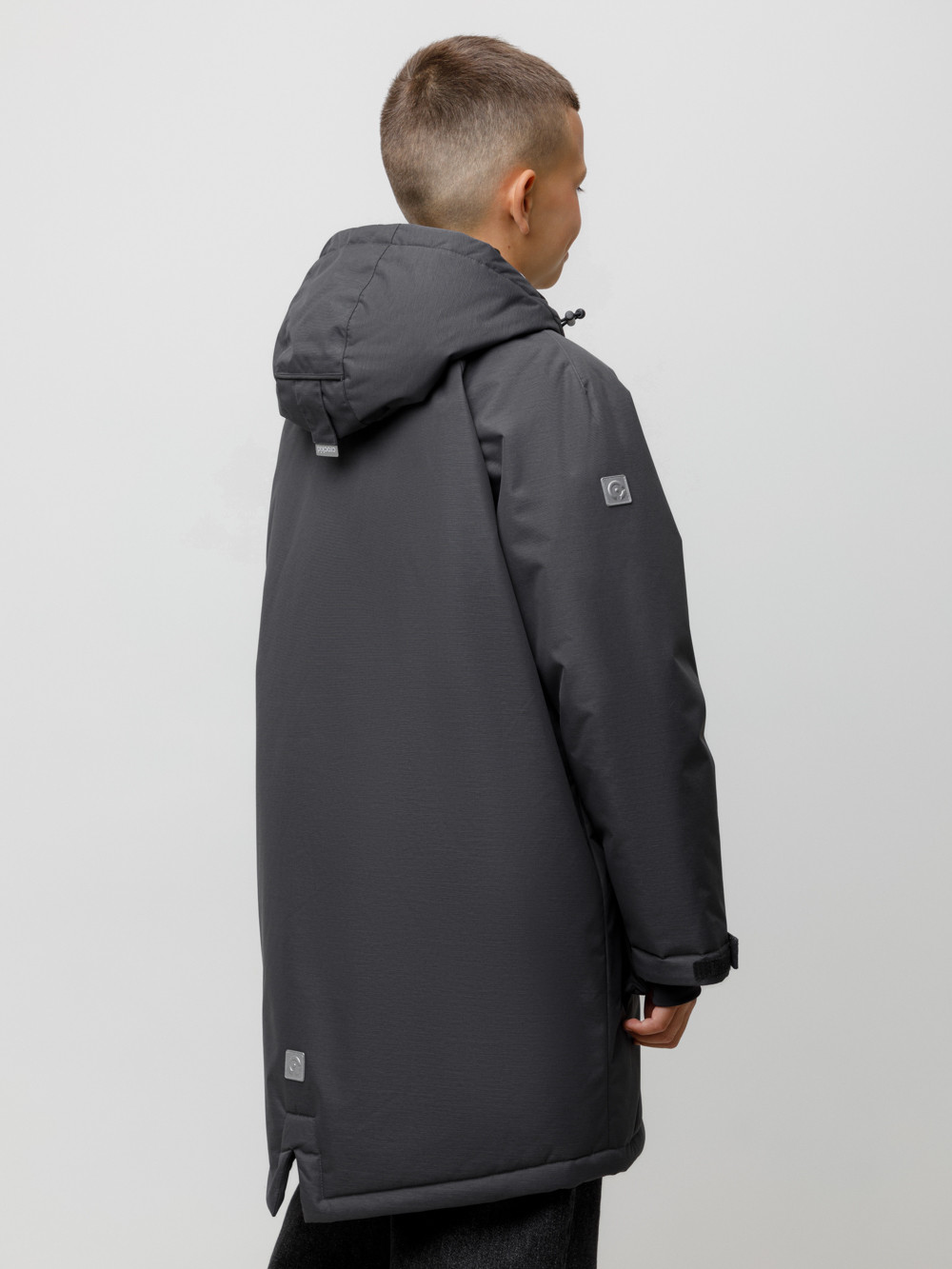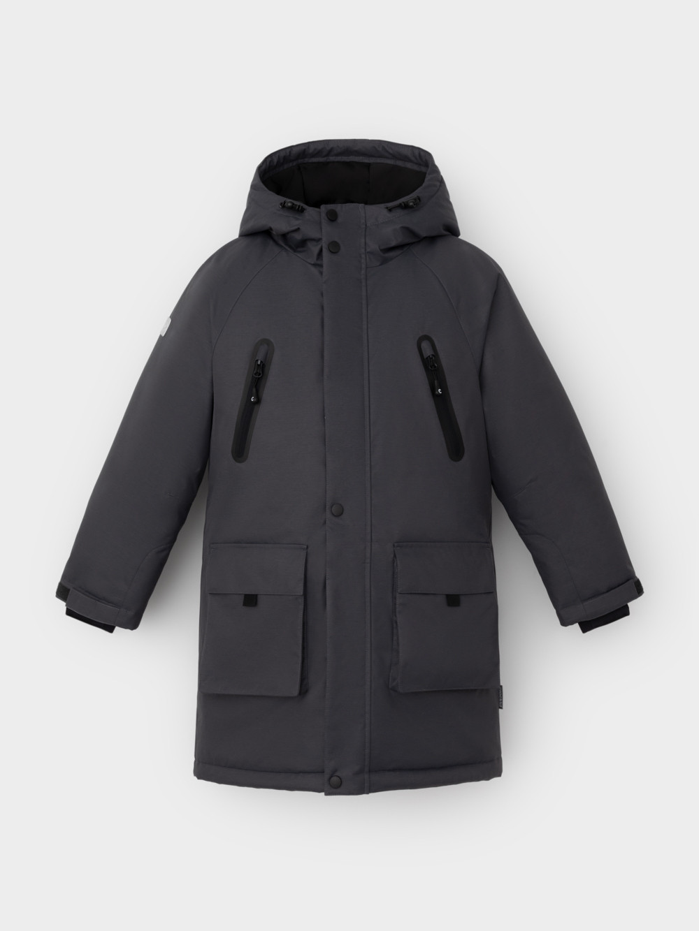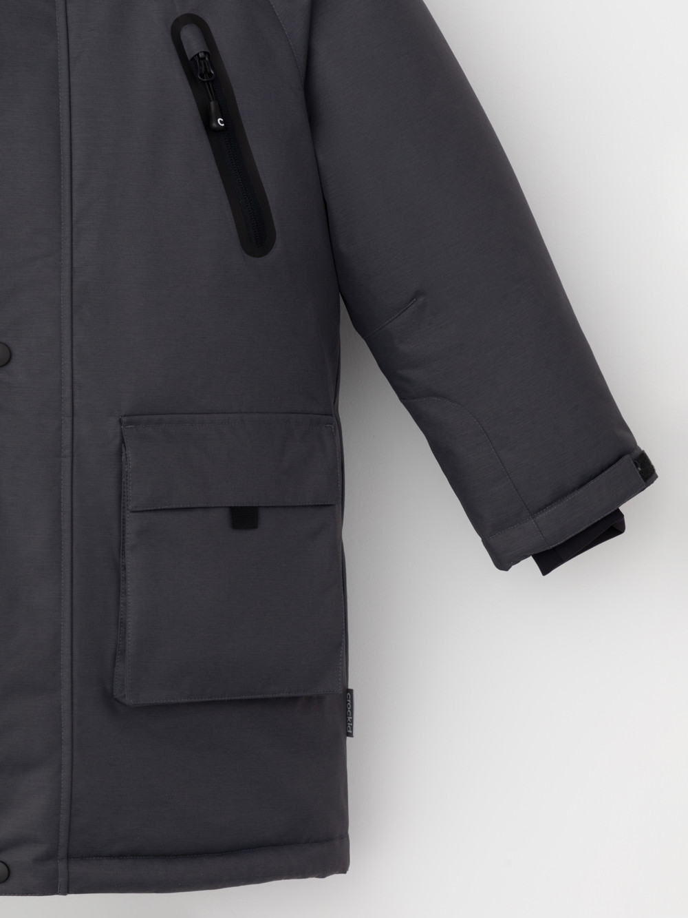 Зимняя парка для мальчика с утеплителем  Fellex®: 250 г/м2. Выполнена из мембранной ткани с дополнительной тефлоновой обработкой, которая предохраняет изделие от загрязнений и отталкивает влагу. Подклад выполнен из 100% полиэстера Tricot. Парка застёгивается на молнию и внешнюю планку с кнопками, предусмотрена защита подбородка. Вшитый капюшон затягивается на эластичную утяжку со стопперами и на шнур. На рукавах внутренние эластичные манжеты, ширина регулируется липучками. Два накладных кармана с клапанами по бокам и два кармана на груди. По талии эластичная утяжка со стопперами. Во всех изделиях верхнего ассортимента для безопасности ребёнка предусмотрены светоотражающие элементы.