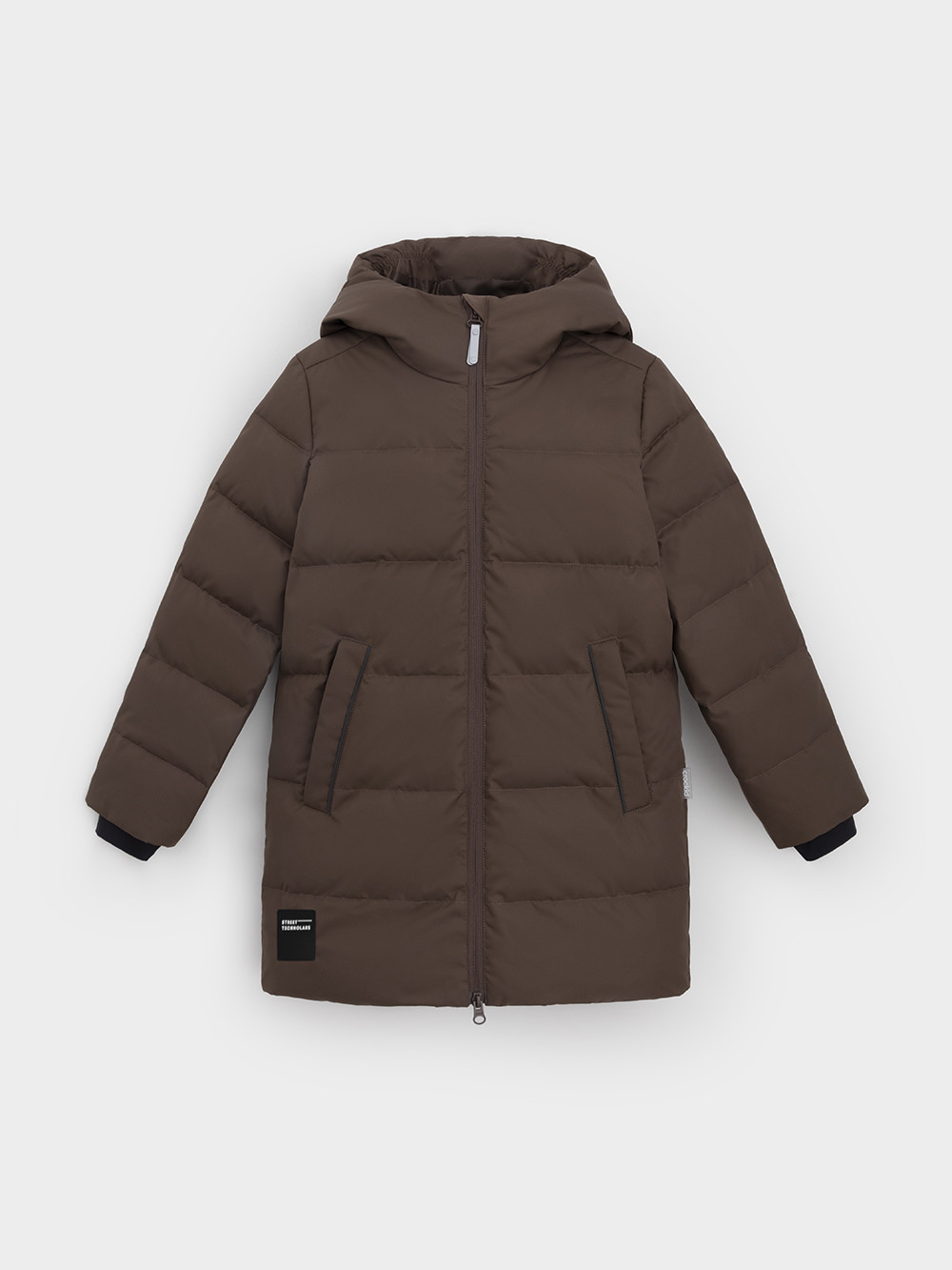 Зимнее пальто для мальчика с натуральным утеплителем из гусиного пуха (70%) и пера (30%). Выполнено из мембранной ткани с дополнительной тефлоновой обработкой, которая предохраняет изделие от загрязнений и отталкивает влагу. Подклад выполнен из 100% полиэстера. Пальто застёгивается на молнию, предусмотрена защита подбородка. Несъёмный капюшон имеет эластичные утяжки. По бокам два кармана на молнии, так же имеется внутренний карман. В рукавах мягкие внутренние манжеты. Во всех изделиях верхнего ассортимента для безопасности ребёнка предусмотрены светоотражающие элементы.