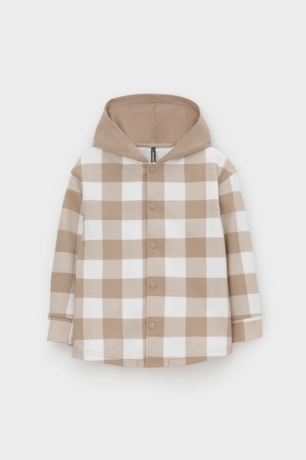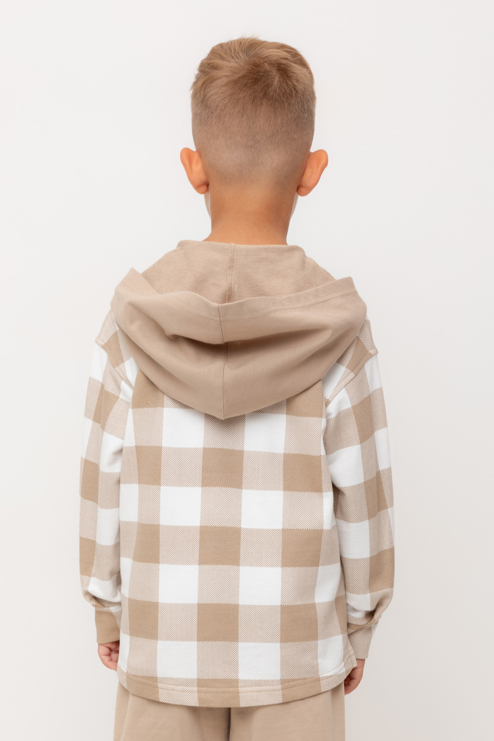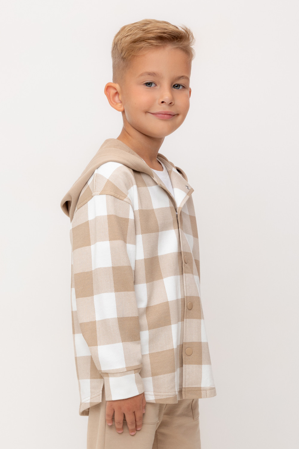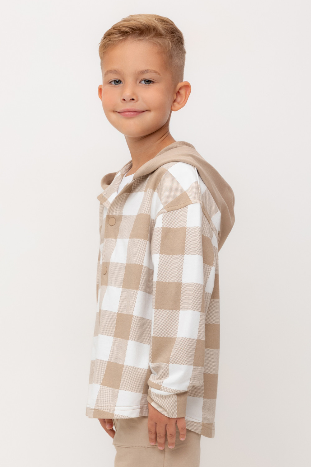 Свободная трикотажная рубашка для мальчика с капюшоном. Выполнена из мягкого петельчатого футера. Застёгивается на кнопки. Модель с закругленным низом и спущенным плечом. По бокам разрезы.