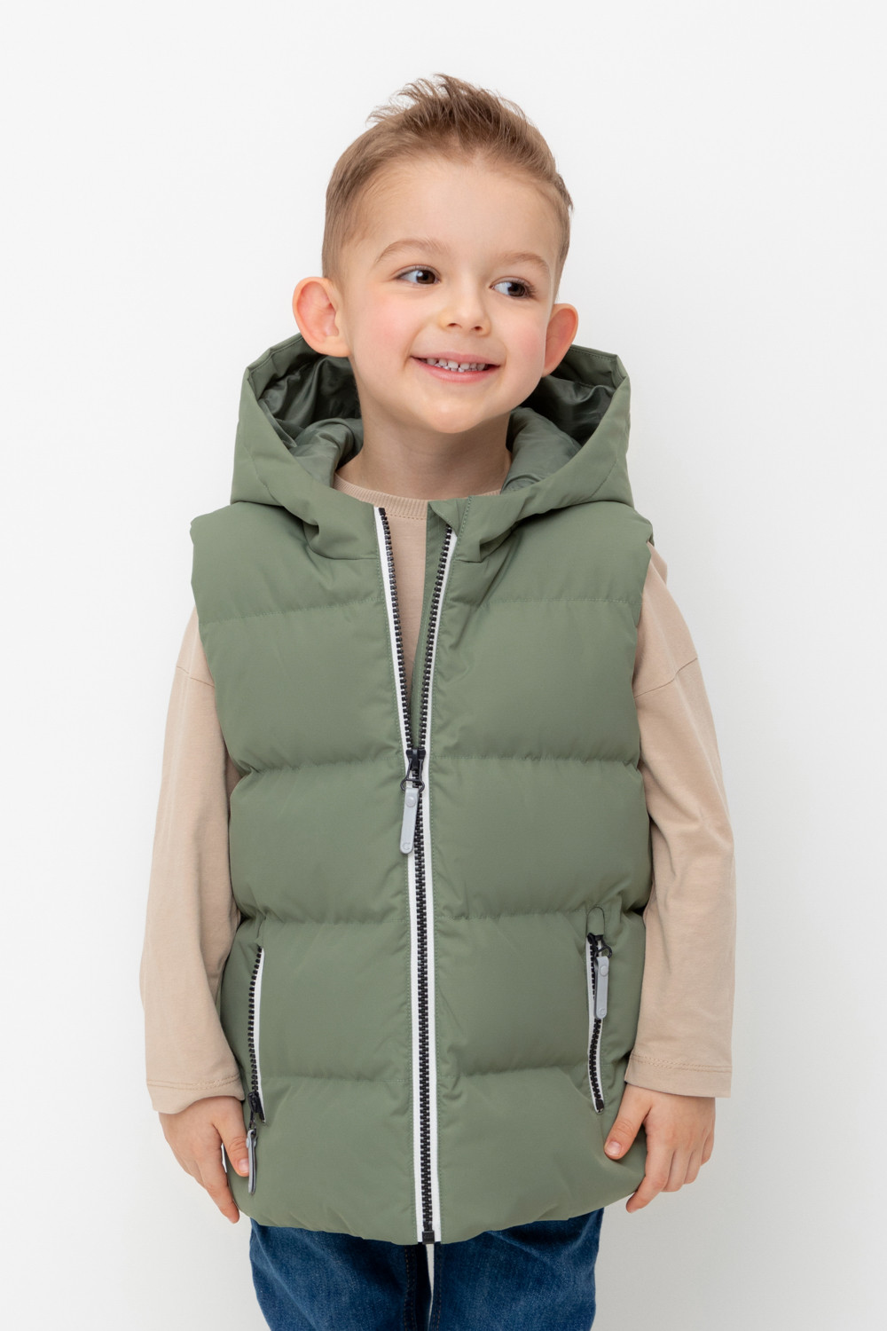 Стеганый жилет с капюшоном для мальчика с утеплителем Fellex®: 120 г/м2. Выполнен из мембранной ткани с дополнительной тефлоновой обработкой. Данный вид обработки предохраняет изделие от загрязнения и лучше отводит влагу. Подклад из 100% полиэстра. Капюшон не снимается. Изделие застёгивается на молнию, предусмотрена защита подбородка. Два кармана по бокам застёгиваются на молнии. Во всех изделиях верхнего ассортимента для безопасности ребенка предусмотрены светоотражающие элементы.