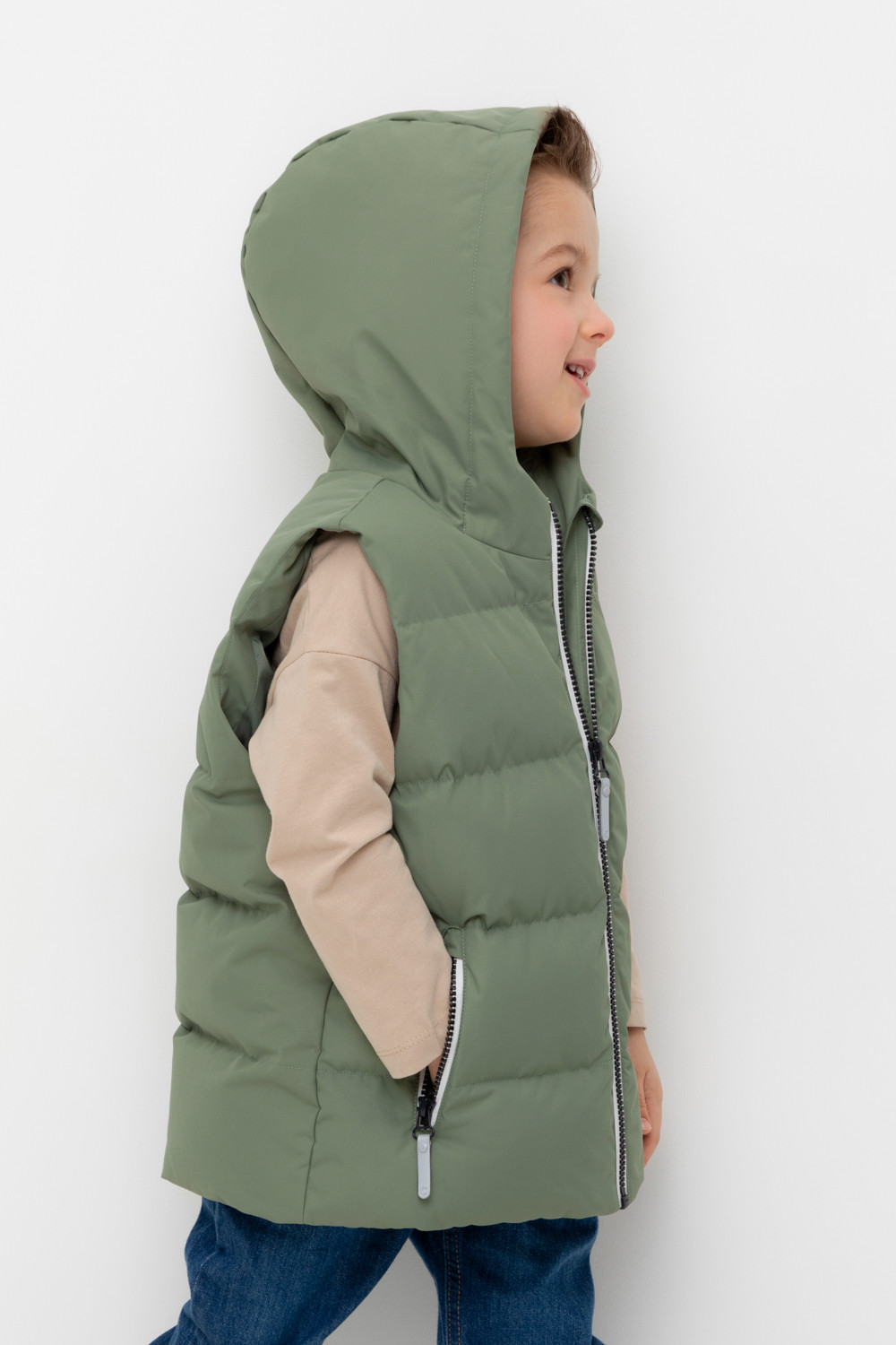 Стеганый жилет с капюшоном для мальчика с утеплителем Fellex®: 120 г/м2. Выполнен из мембранной ткани с дополнительной тефлоновой обработкой. Данный вид обработки предохраняет изделие от загрязнения и лучше отводит влагу. Подклад из 100% полиэстра. Капюшон не снимается. Изделие застёгивается на молнию, предусмотрена защита подбородка. Два кармана по бокам застёгиваются на молнии. Во всех изделиях верхнего ассортимента для безопасности ребенка предусмотрены светоотражающие элементы.