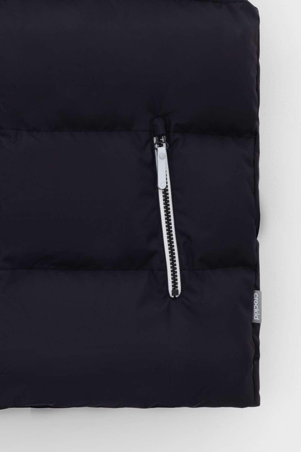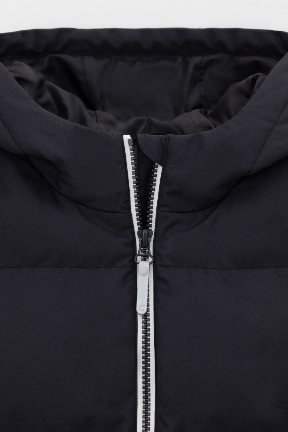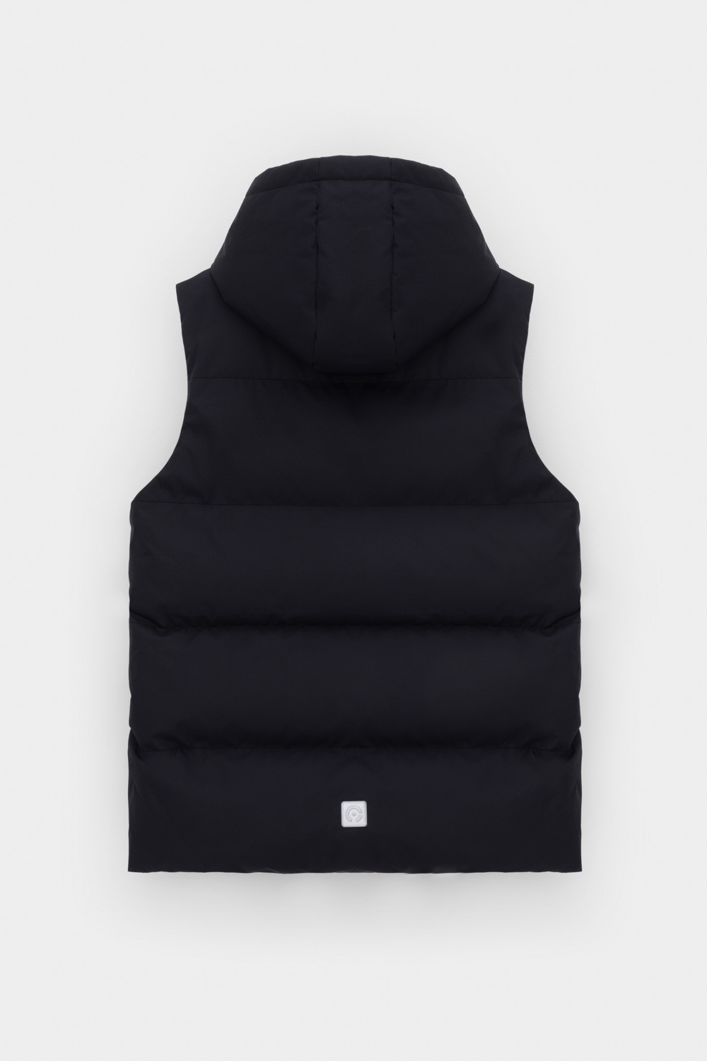 Стеганый жилет с капюшоном для мальчика с утеплителем Fellex®: 120 г/м2. Выполнен из мембранной ткани с дополнительной тефлоновой обработкой. Данный вид обработки предохраняет изделие от загрязнения и лучше отводит влагу. Подклад из 100% полиэстра. Капюшон не снимается. Изделие застёгивается на молнию, предусмотрена защита подбородка. Два кармана по бокам застёгиваются на молнии. Во всех изделиях верхнего ассортимента для безопасности ребенка предусмотрены светоотражающие элементы.