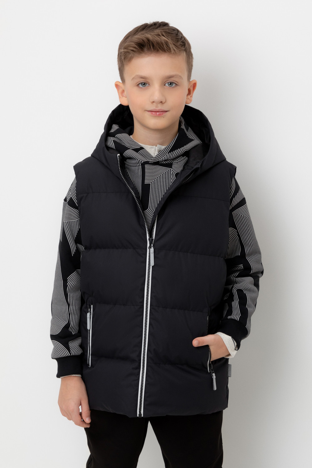 Стеганый жилет с капюшоном для мальчика с утеплителем Fellex®: 120 г/м2. Выполнен из мембранной ткани с дополнительной тефлоновой обработкой. Данный вид обработки предохраняет изделие от загрязнения и лучше отводит влагу. Подклад из 100% полиэстра. Капюшон не снимается. Изделие застёгивается на молнию, предусмотрена защита подбородка. Два кармана по бокам застёгиваются на молнии. Во всех изделиях верхнего ассортимента для безопасности ребенка предусмотрены светоотражающие элементы.