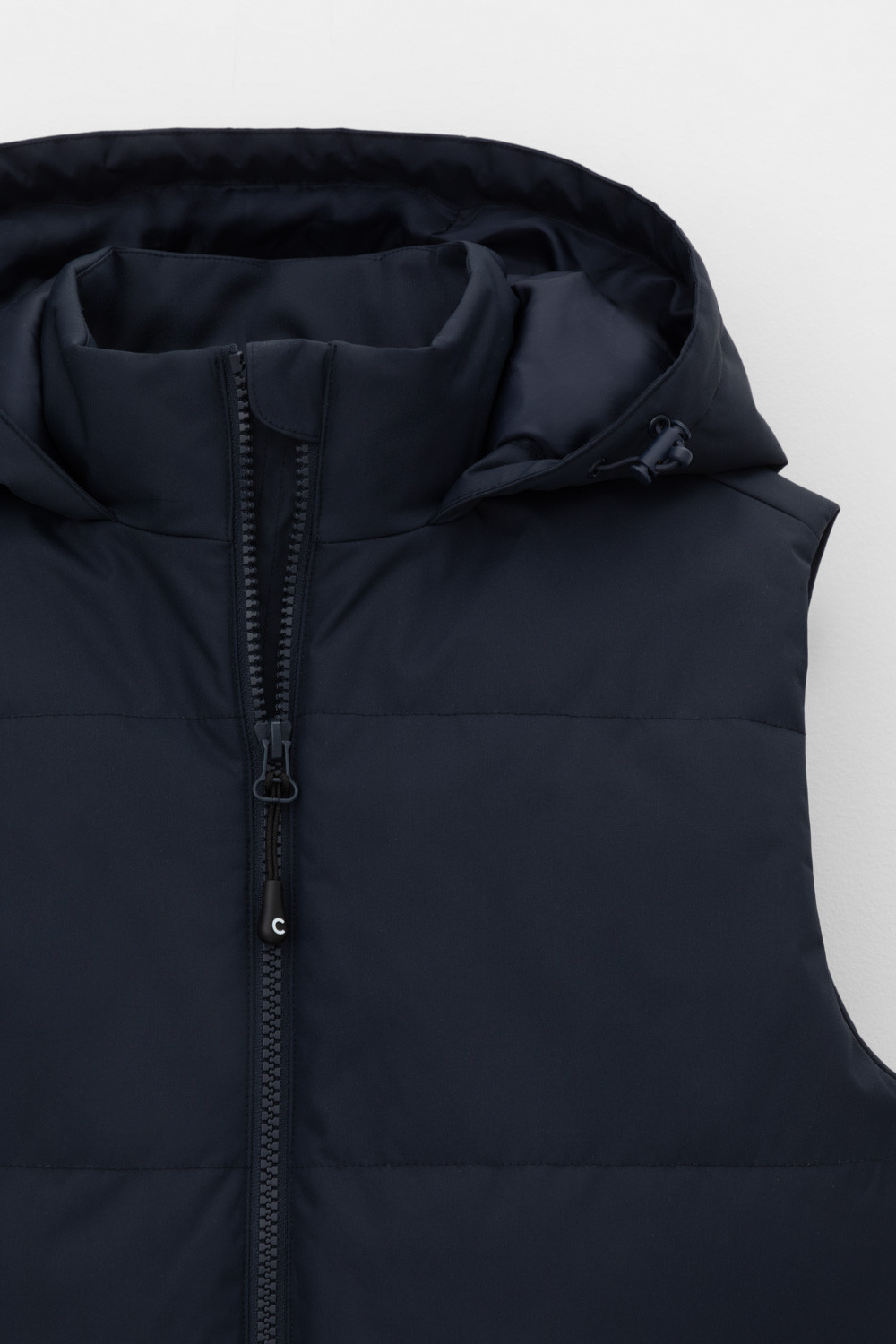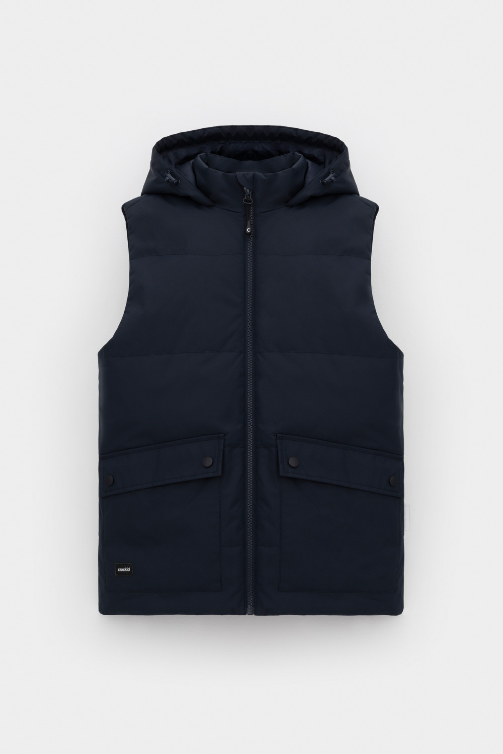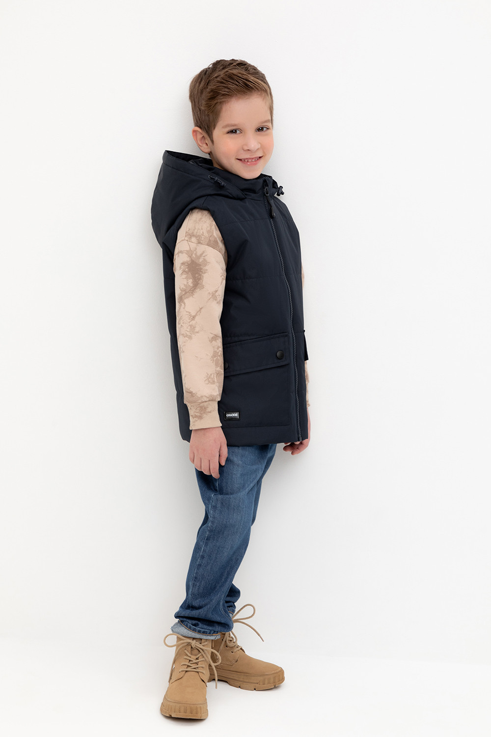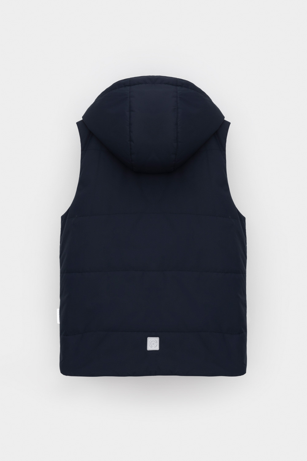 Стеганый жилет с капюшоном для мальчика с утеплителем Fellex®: 120 г/м2. Выполнен из мембранной ткани с дополнительной тефлоновой обработкой. Данный вид обработки предохраняет изделие от загрязнения и лучше отводит влагу. Подклад из 100% полиэстра. У изделия предусмотрена защита подбородка. Капюшон утягивается при помощи эластичного шнура со стопперами. Накладные карманы с клапанами на кнопках. Во всех изделиях верхнего ассортимента для безопасности ребенка предусмотрены светоотражающие элементы.