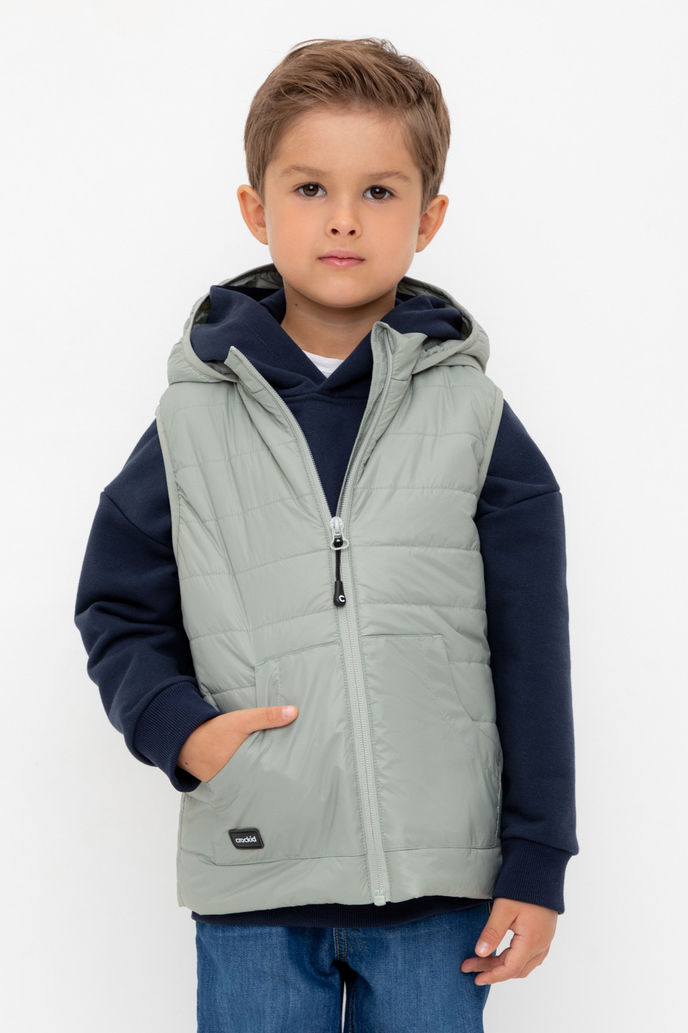 Стеганый жилет с капюшоном для мальчика с утеплителем Fellex®: 120 г/м2. Выполнен из мембранной ткани с дополнительной тефлоновой обработкой. Данный вид обработки предохраняет изделие от загрязнения и лучше отводит влагу. Подклад: 60% хлопок и 40% полиэстер на размерах 86-92 и 92-98 и 100% полиэстер на остальных размерах. У изделия предусмотрена защита подбородка. Спереди два кармана. Во всех изделиях верхнего ассортимента для безопасности ребенка предусмотрены светоотражающие элементы.
