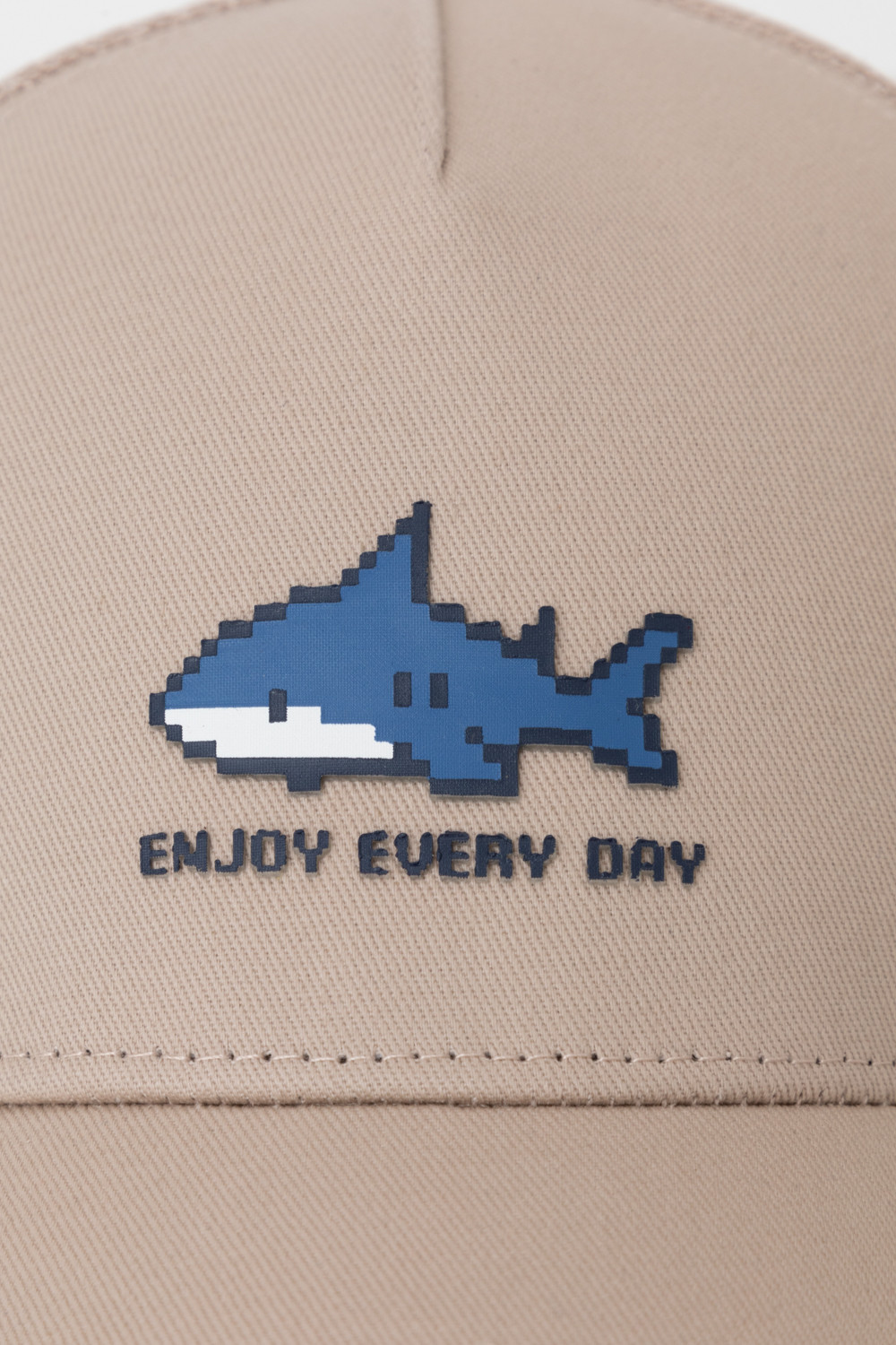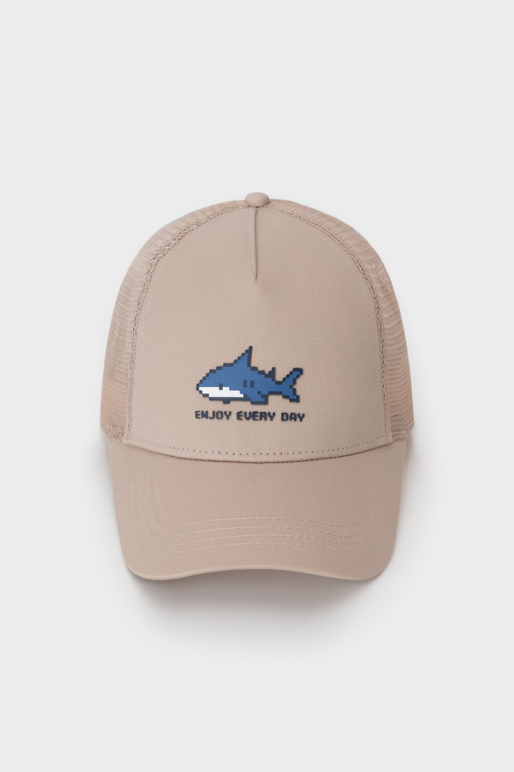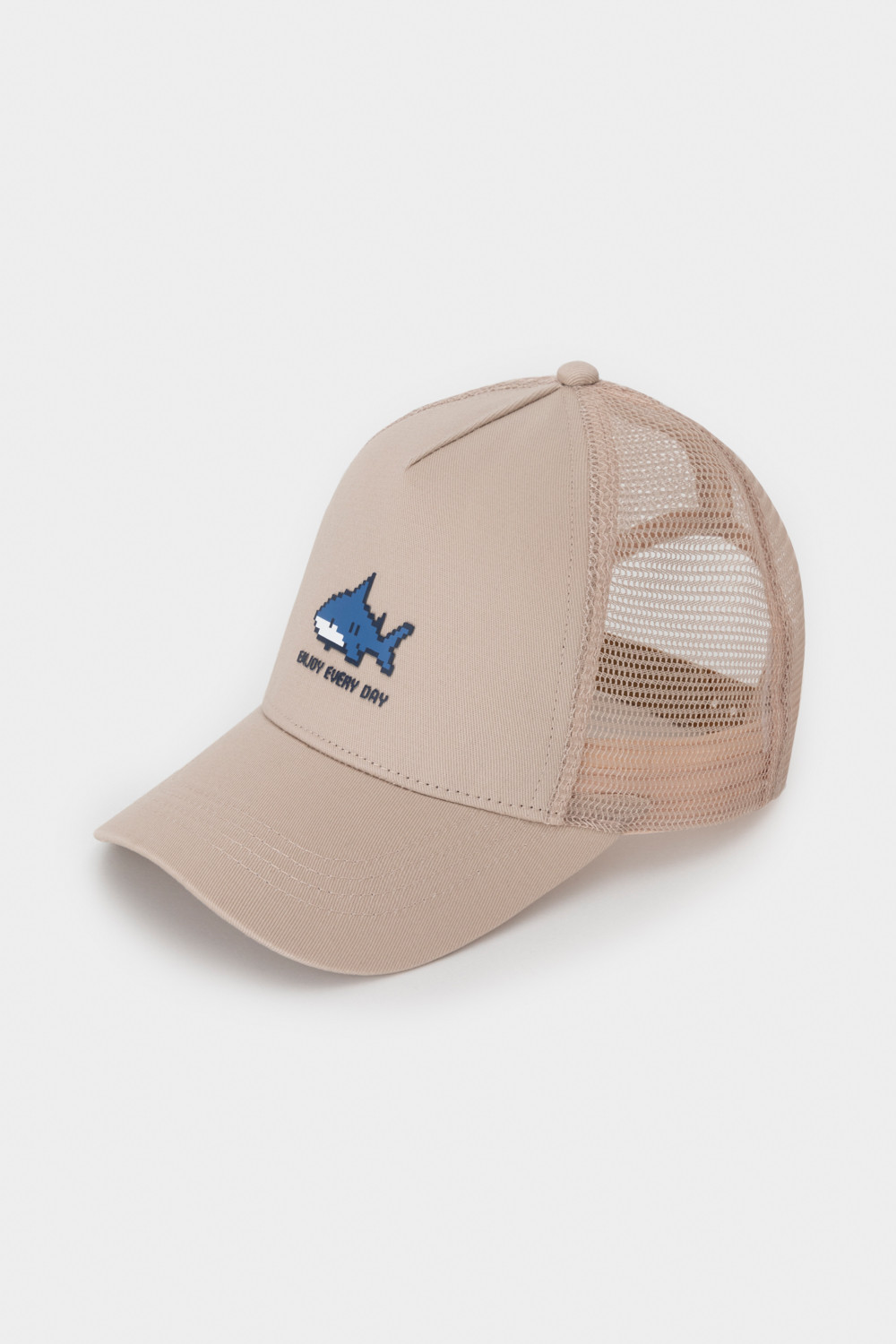 Кепка для мальчика из текстиля и сетки. Спереди украшена оригинальным принтом.  Регулируется по ширине головы и фиксируется на затылке с помощью пластиковой застёжки.