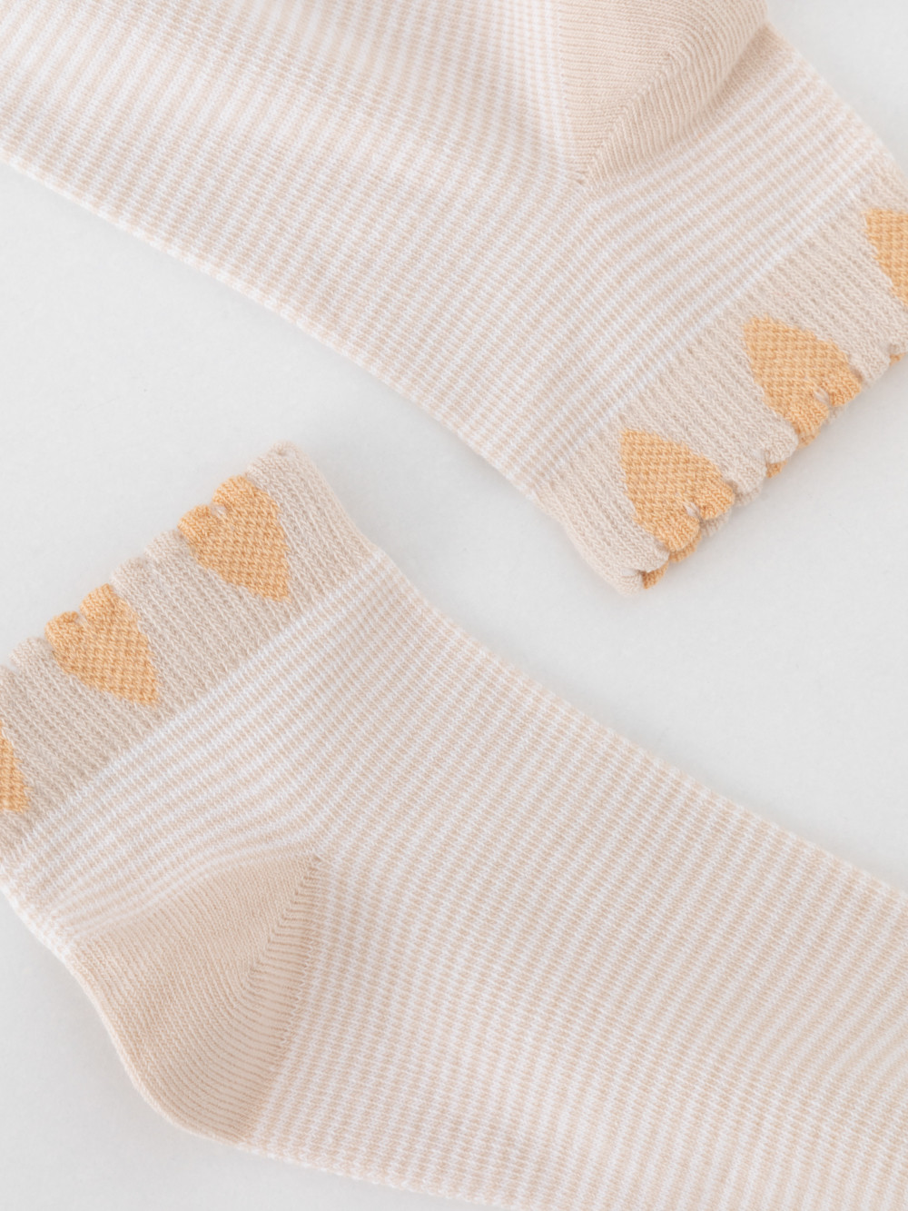 Носки короткие детские с формованной пяткой и эластичной резинкой по краю. Украшены рисунком в полоску. Изделие сохраняет форму и стойкий цвет после многочисленных стирок.
