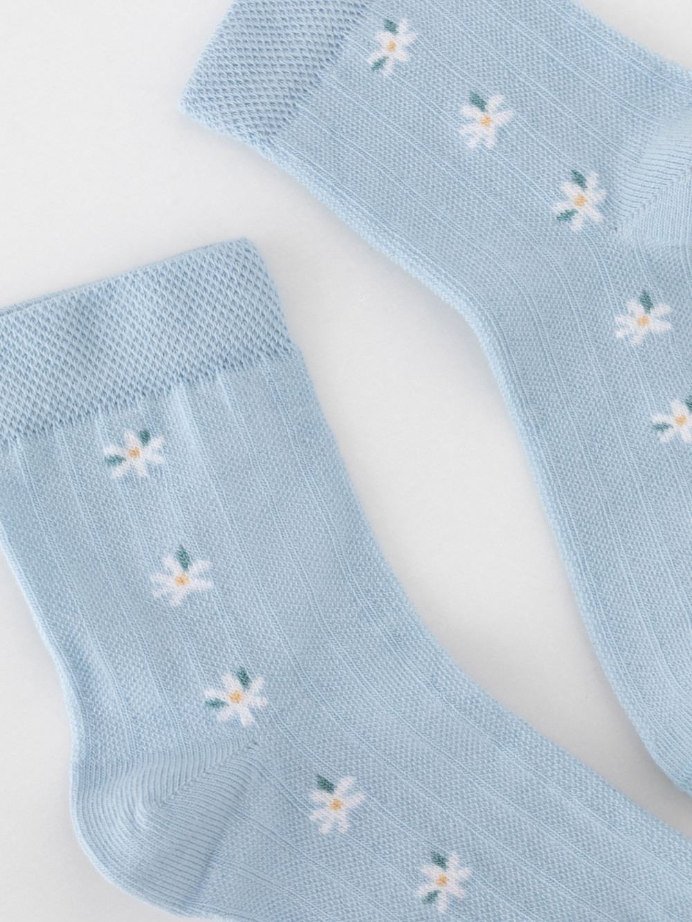 Носки длинные детские с формованной пяткой и эластичной резинкой по краю. Украшены рисунком в цветочек. Изделие сохраняет форму и стойкий цвет после многочисленных стирок.