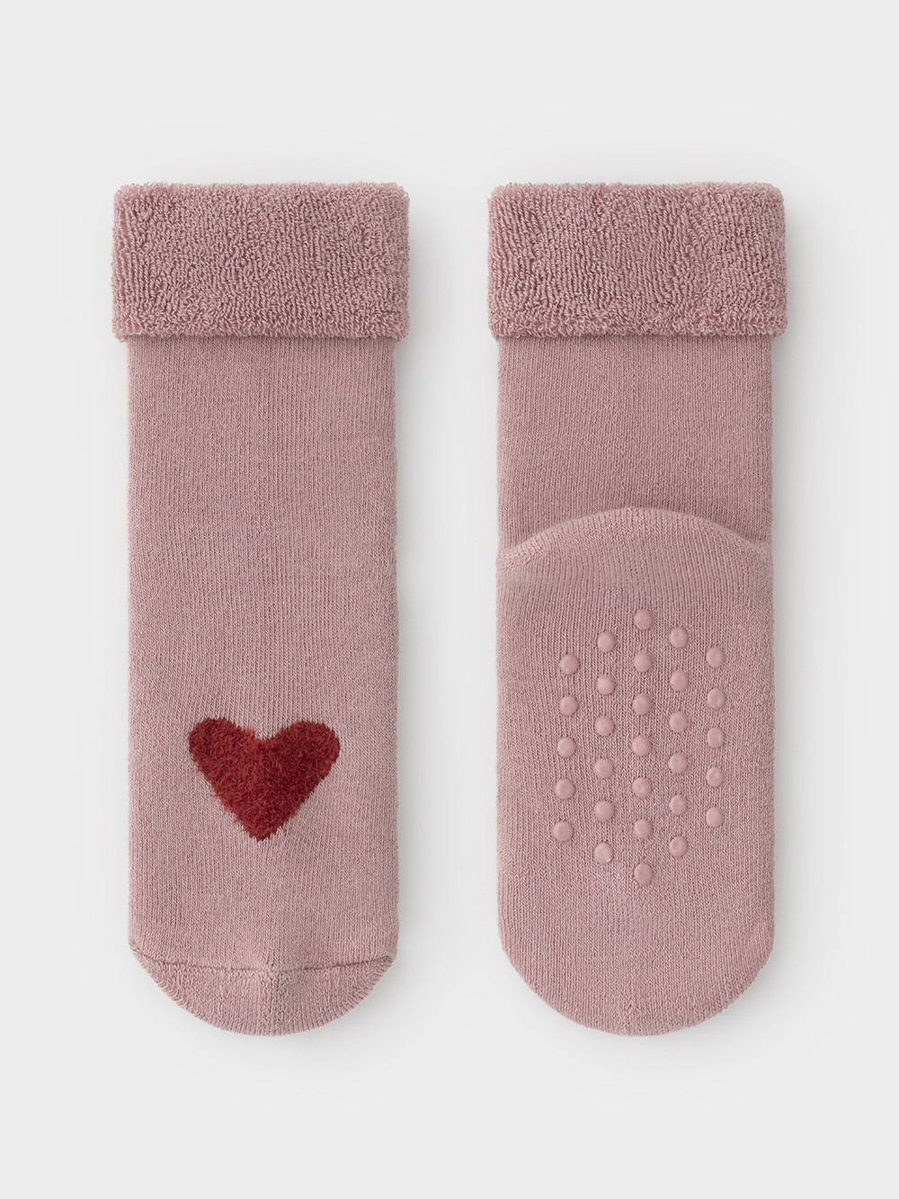 Носки махровые с формованной пяткой и отворотом по краю. На подошве резиновые стопперы. Украшены рисунком. Изделие сохраняет форму и стойкий цвет после многочисленных стирок.