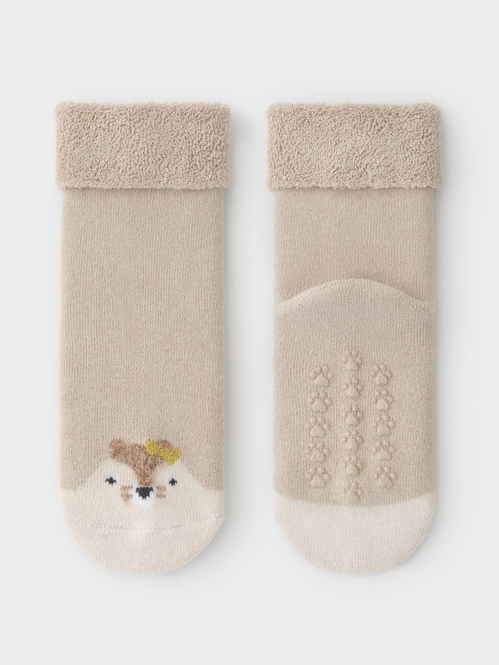 Носки махровые с формованной пяткой и отворотом по краю. На подошве резиновые стопперы. Украшены рисунком. Изделие сохраняет форму и стойкий цвет после многочисленных стирок.