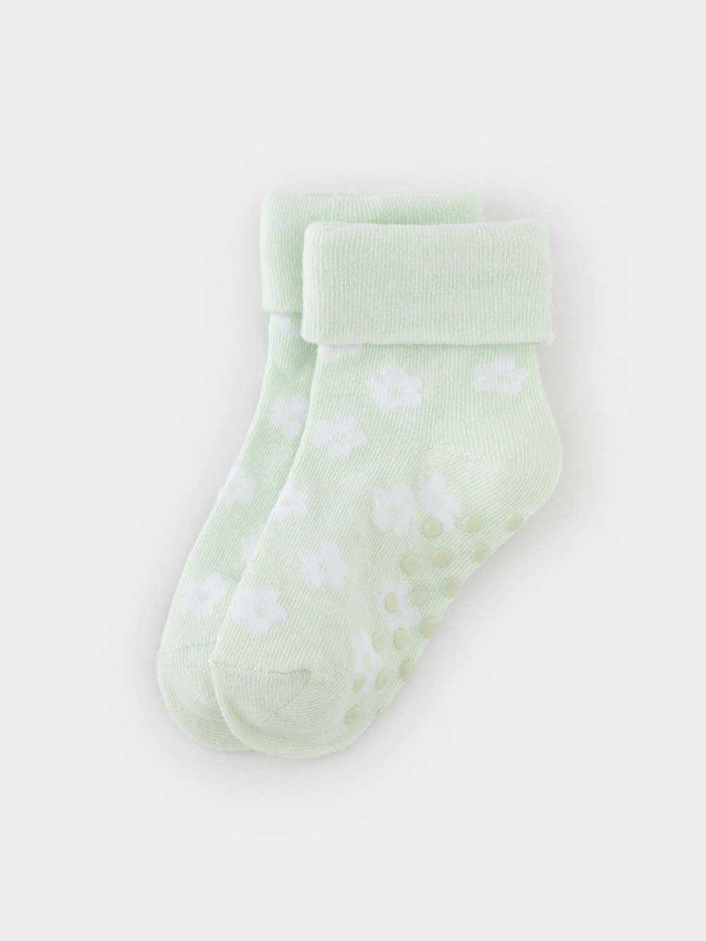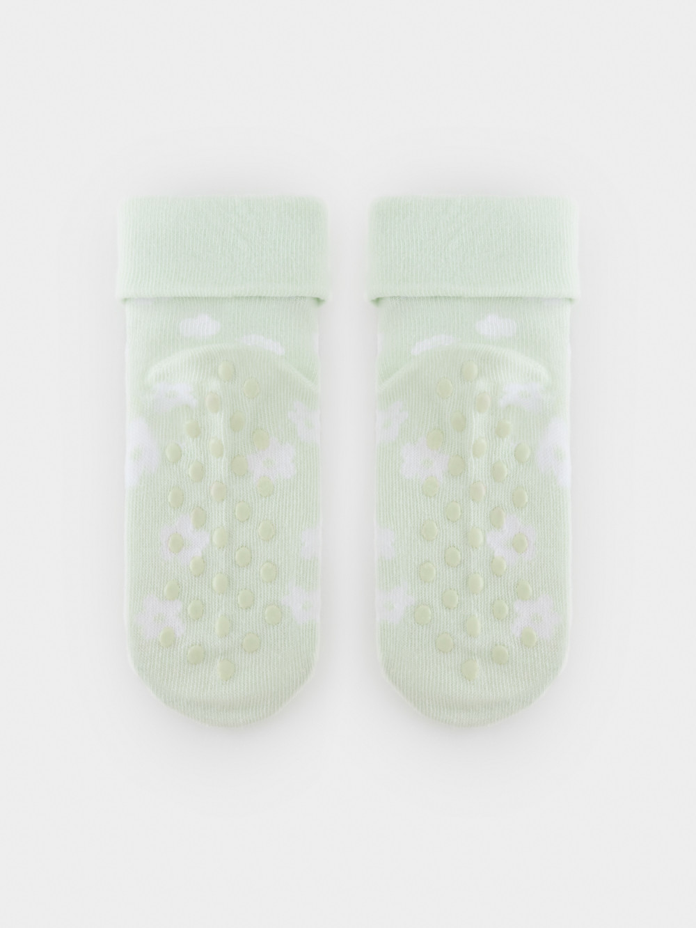 Носки детские с формованной пяткой и отворотом. Украшены рисунком. На стопе противоскользящие стопперы. Изделие сохраняет форму и стойкий цвет после многочисленных стирок.