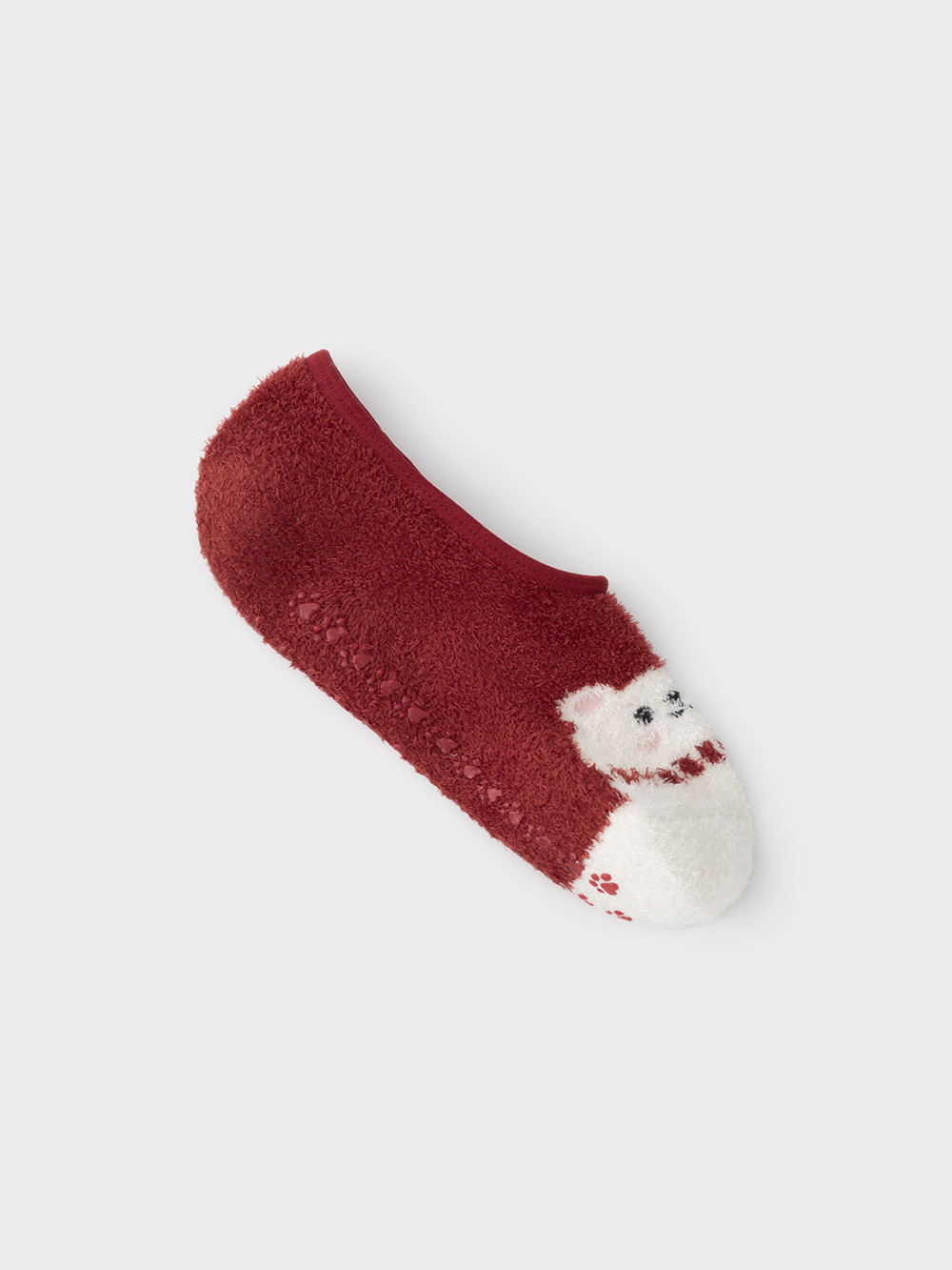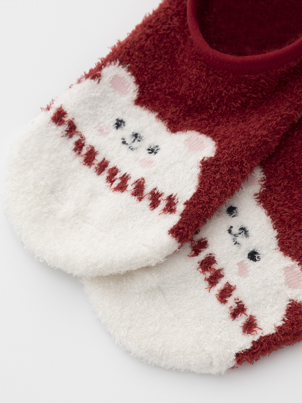 Тёплые пушистые следки для детей с формованной пяткой и эластичной резинкой по краю. На подошве резиновые стопперы. Украшены рисунком. Отлично подойдут для создания праздничных образов или как дополнение к подарку на Новый год и Рождество.  Изделие сохраняет форму и стойкий цвет после многочисленных стирок.