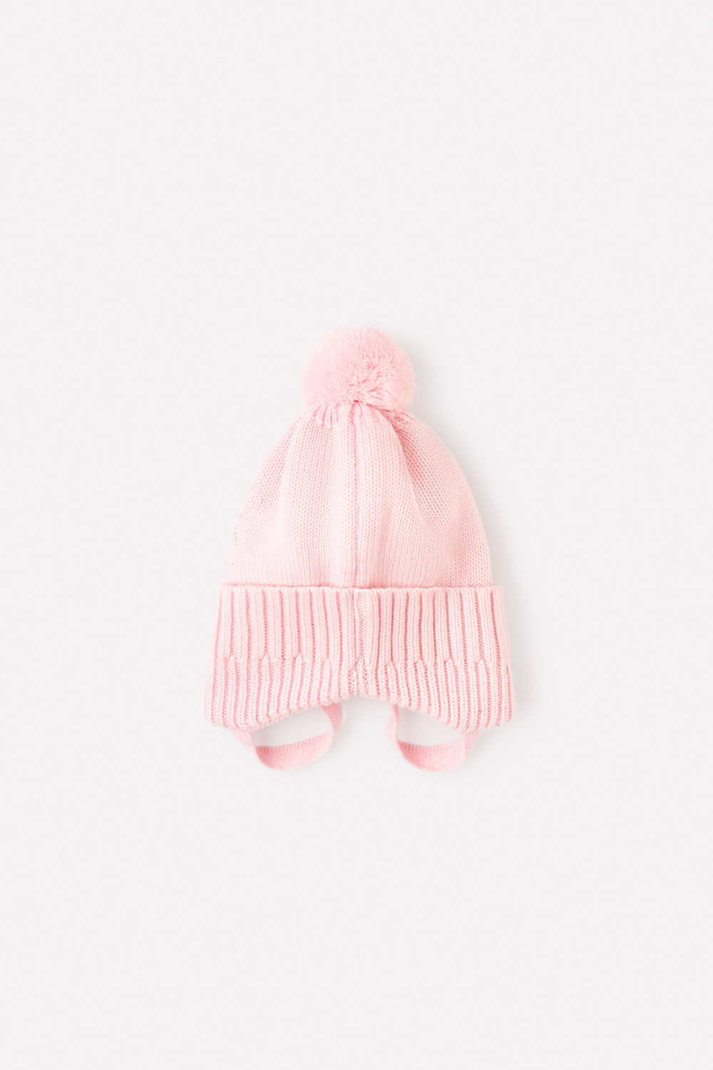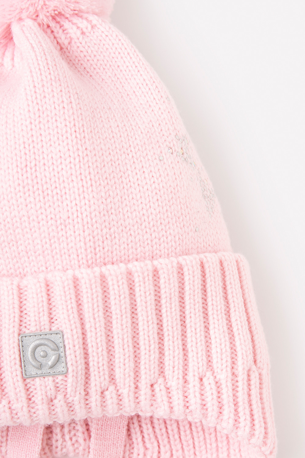 Светло-розовая шапка из полушерсти на завязках. Внутри - мягкая подкладка из трикотажа интерлок. Украшена вязаным помпоном на макушке и блестящими стразами. Для безопасности в тёмное время суток на передней части шапочки прикреплён светоотражатель.