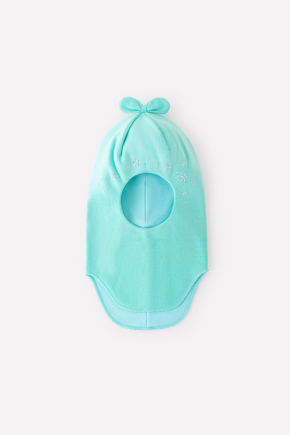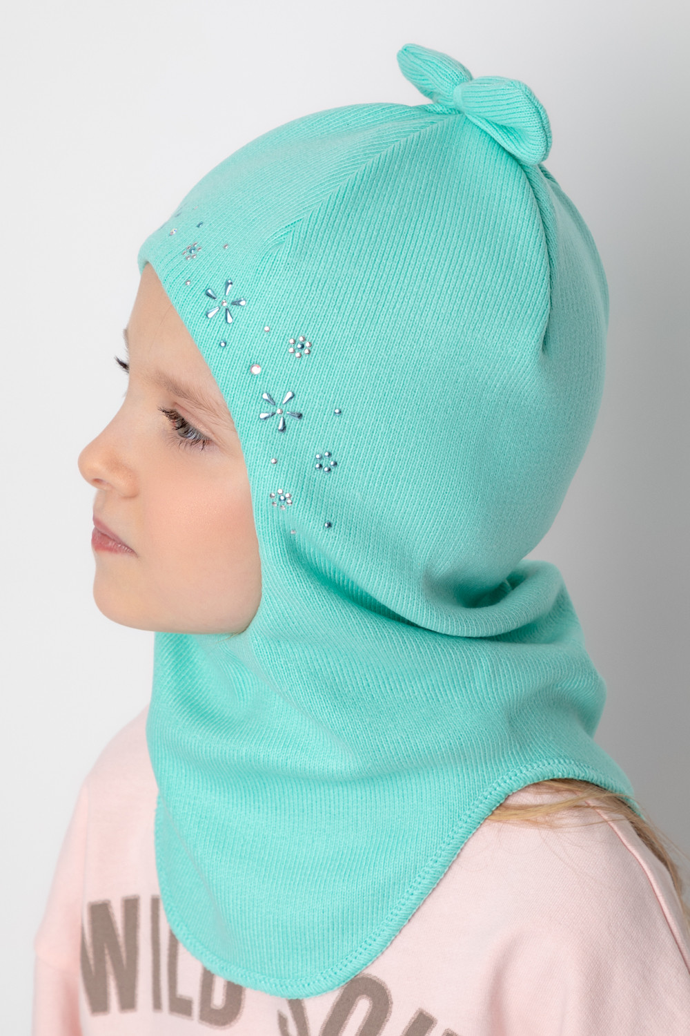 Шапка-шлем из акриловой пряжи со стразами. Внутри - мягкая подкладка из интерлока. На макушке - бантик.