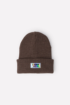 Тёплая вязаная шапка в тёмно-бежевом оттенке с высоким отворотом для девочки. На отвороте прикреплена блестящая нашивка с надписью.