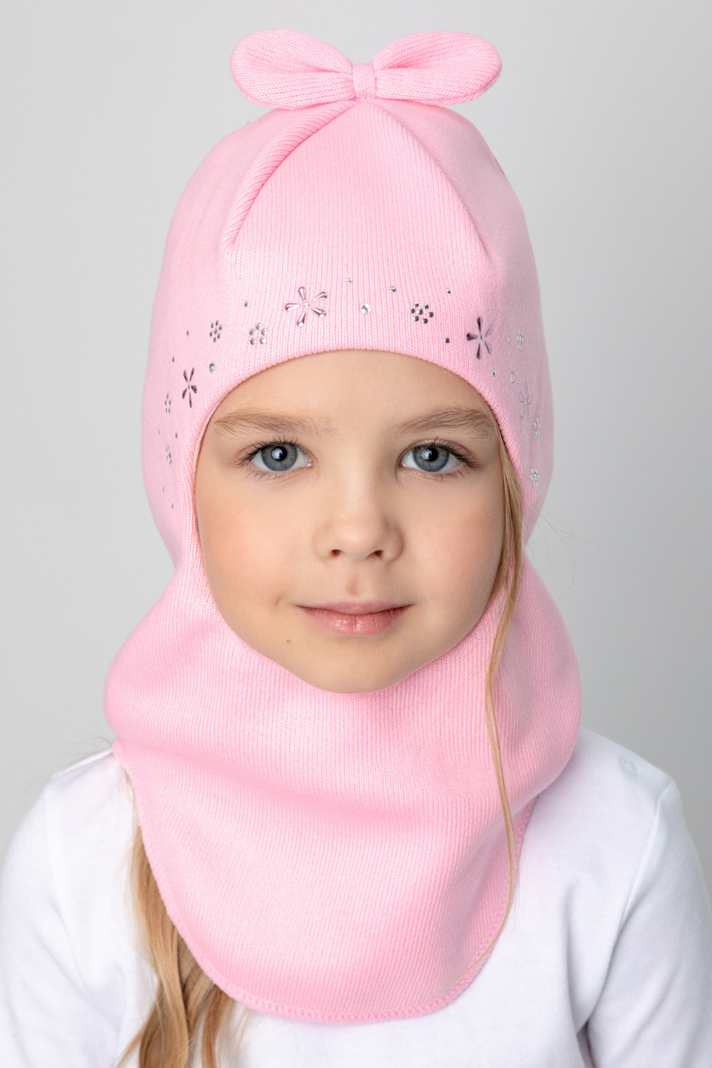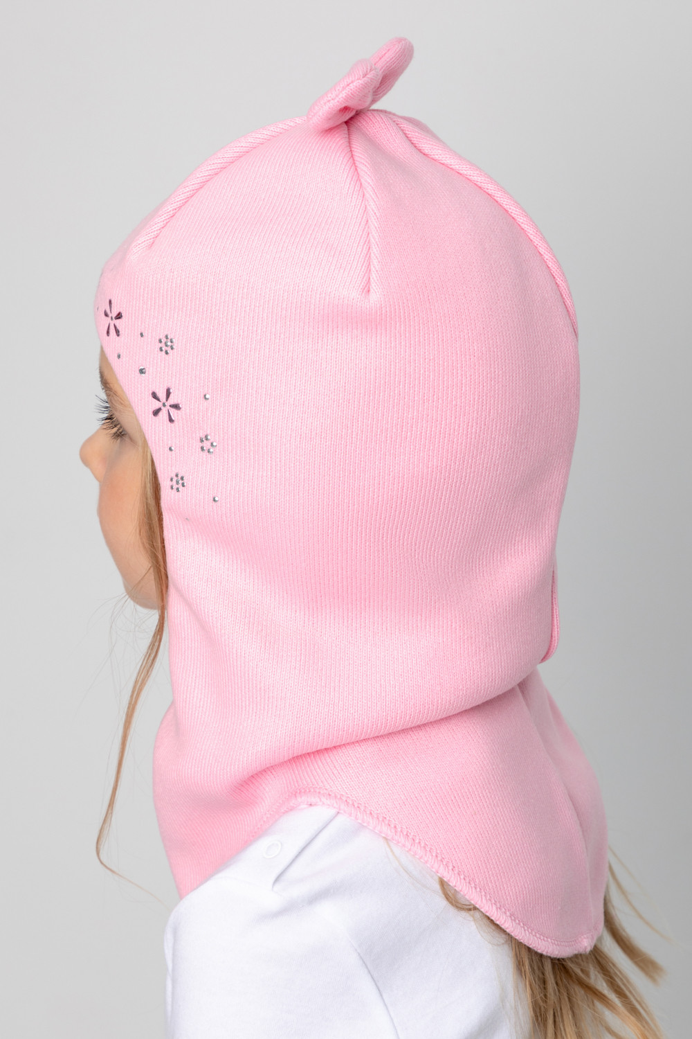 Шапка-шлем из акриловой пряжи со стразами. Внутри - мягкая подкладка из интерлока. На макушке - бантик.