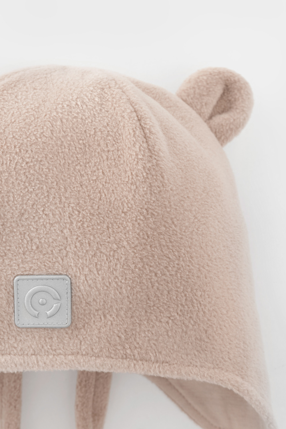 Флисовая шапка на завязках с мягким подкладом из натурального хлопка. Сверху украшена декоративными ушками из флиса. Спереди прикреплён светоотражатель, который обеспечивает дополнительную безопасность в тёмное время суток. Шапка сохраняет цвет и форму после многократных стирок.