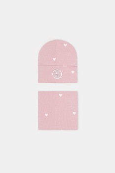 Комплект для девочки: шапка и снуд из хлопкового трикотажа в рубчик с добавлением эластана. Набивка выполнена из стойких гипоаллергенных красителей. Изделия хорошо тянутся, после многократных стирок сохраняют цвет и форму.