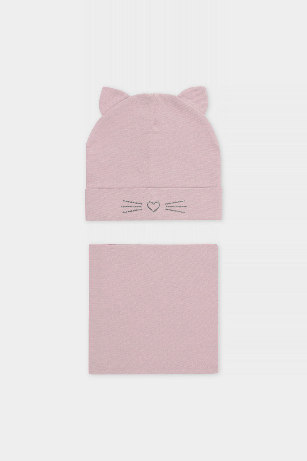 Комплект для девочки: шапка и снуд из хлопкового трикотажа с добавлением эластана, окрашенного стойкими гипоаллергенными текстильными красителями. Изделия хорошо тянутся, после многократных стирок сохраняют цвет и форму.