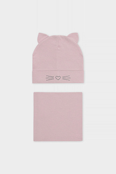Комплект для девочки: шапка и снуд из хлопкового трикотажа с добавлением эластана, окрашенного стойкими гипоаллергенными текстильными красителями. Изделия хорошо тянутся, после многократных стирок сохраняют цвет и форму.