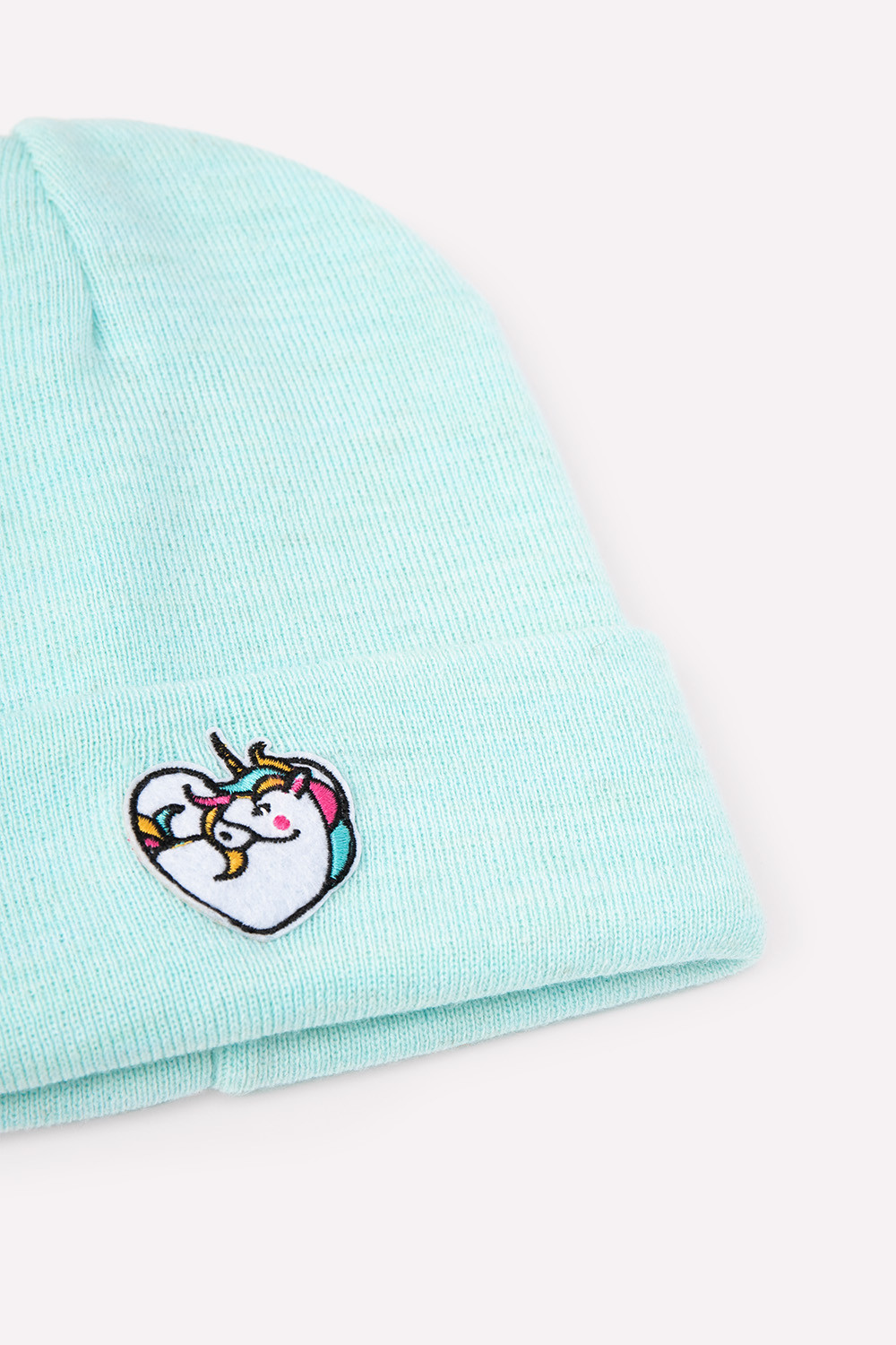 Однотонная бирюзовая шапка с отворотом из полушерсти. Украшена нашивкой с изображением единорожки.