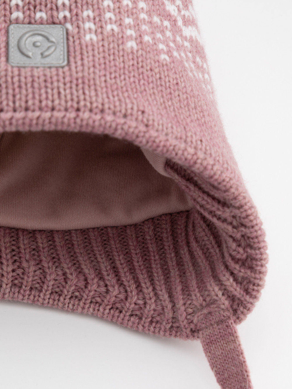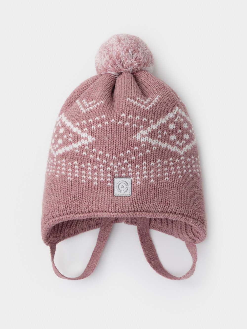 Шапка из полушерсти на завязках с синтепоновым утеплителем. Подклад из натурального хлопка. Полностью закрывает голову, уши и шею, защищая ребёнка от холодного воздуха и ветра. На макушке помпон. Изделие сохраняет форму и стойкий цвет после многочисленных стирок.