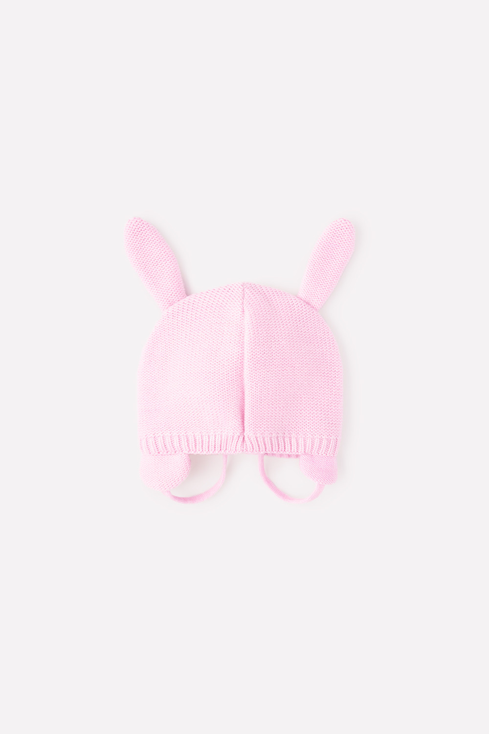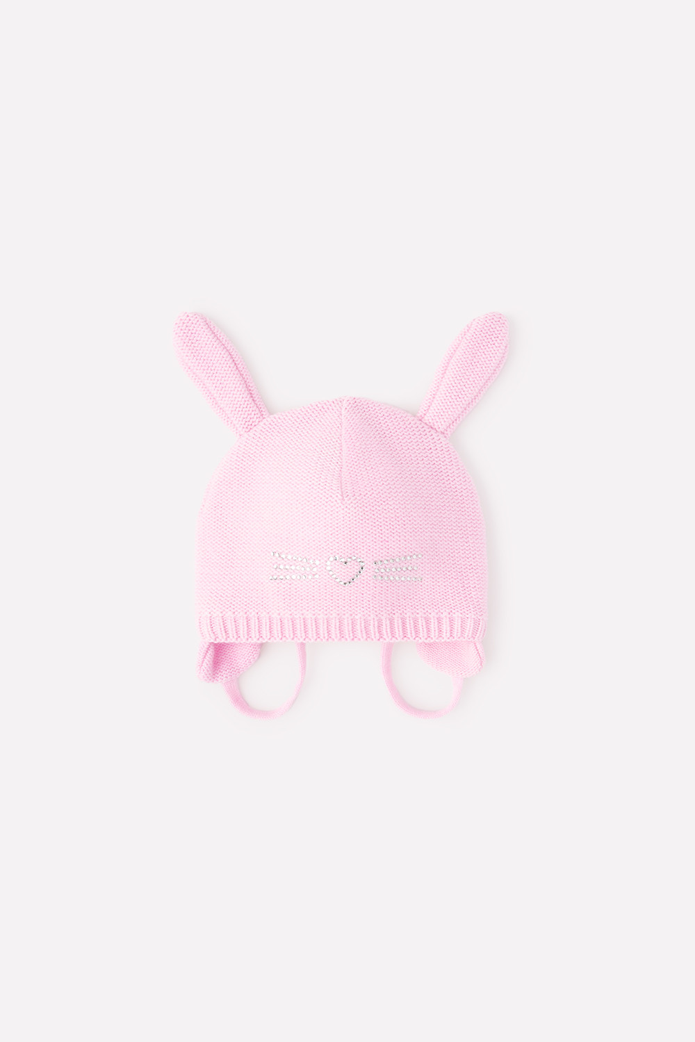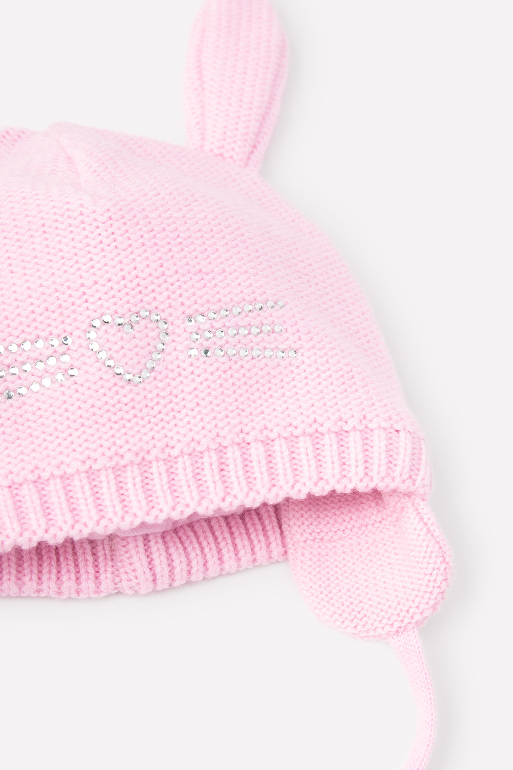 Розовая шапка из полушерсти на завязках. Внутри - мягкая подкладка из трикотажа интерлок. Украшена вязаными заячьими ушками на макушке и стразами.