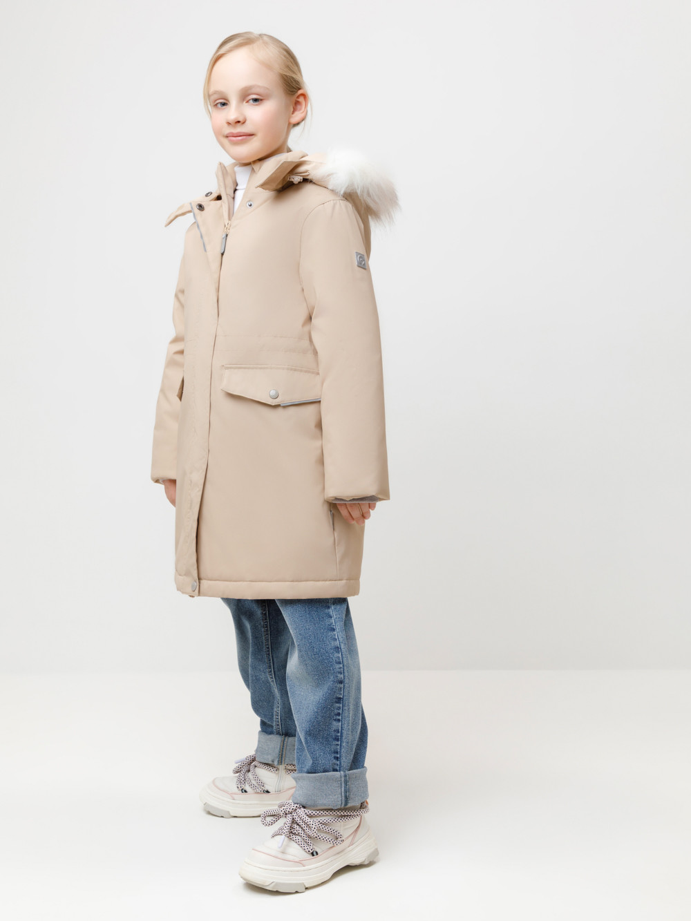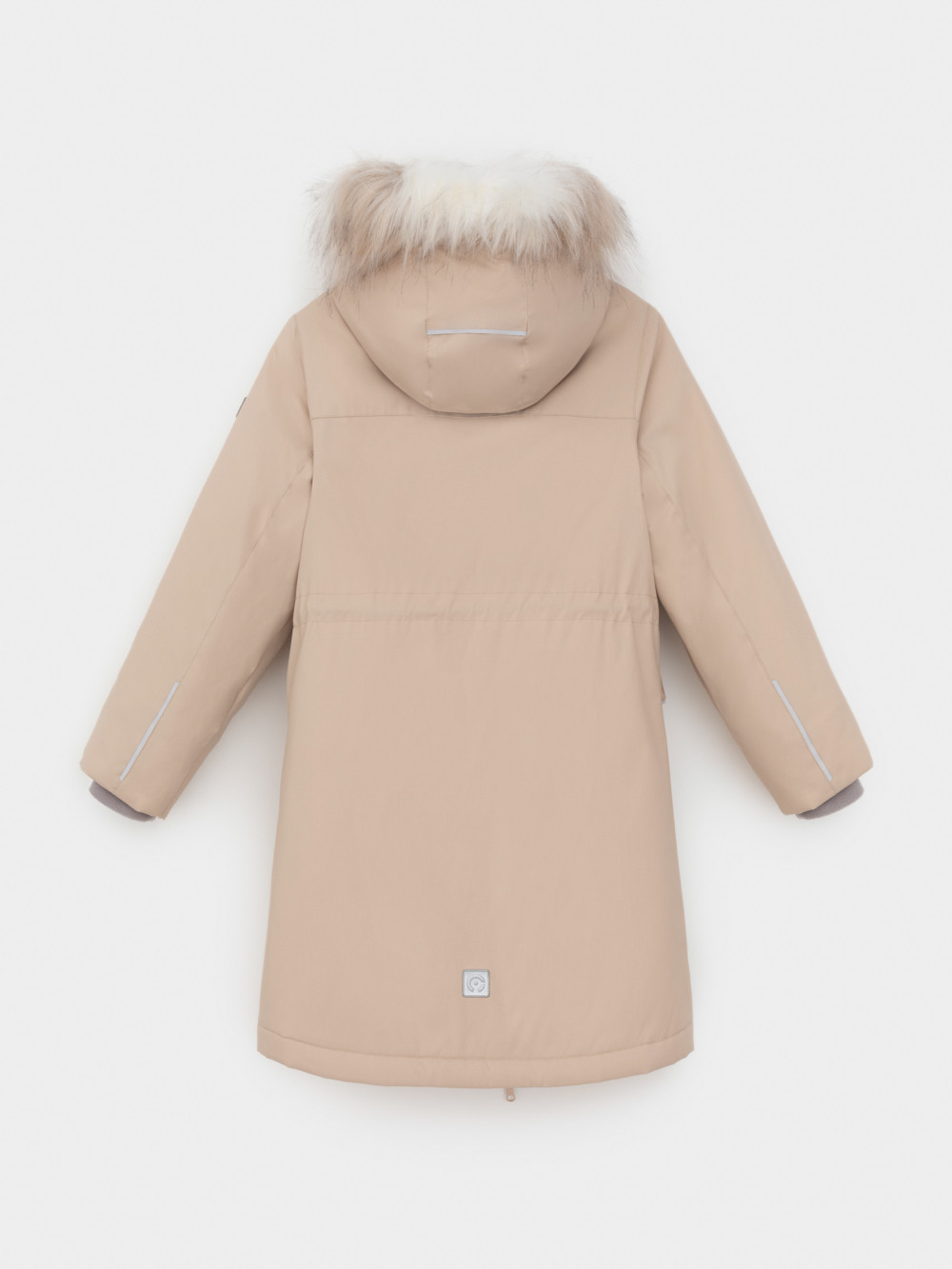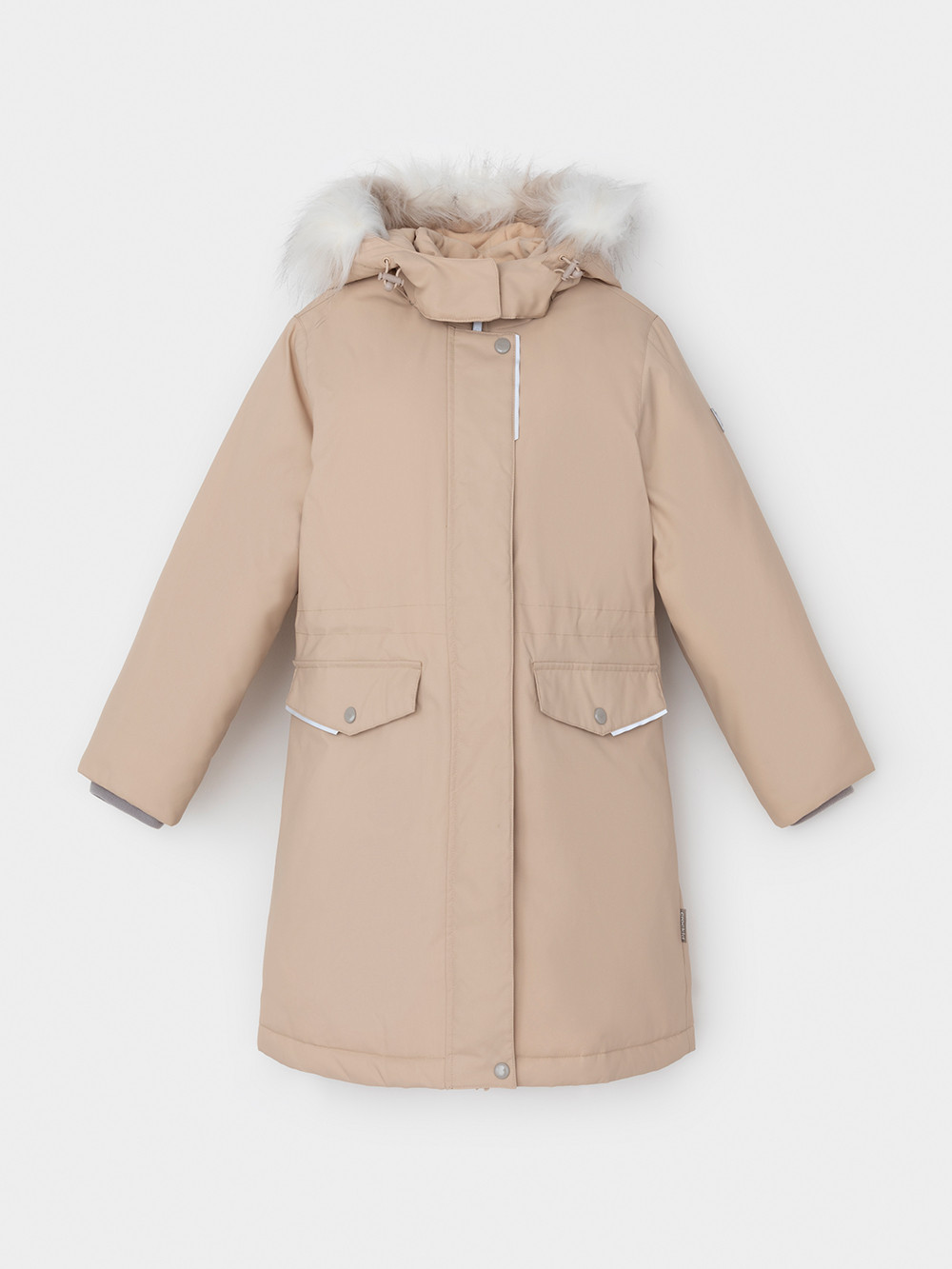 Зимнее пальто для девочки с утеплителем SEE®: 250 г/м2. Выполнено из мембранной ткани с дополнительной тефлоновой обработкой, которая предохраняет изделие от загрязнений и отталкивает влагу. Подклад выполнен из 100% полиэстера Tricot. Пальто застёгивается на молнию, предусмотрена защита подбородка. Съёмный капюшон на кнопках и липучках имеет отстёгивающийся искусственный мех. На рукавах мягкие манжеты. По бокам два кармана с клапанами, внутри карман на молнии. По талии эластичная утяжка со стопперами для регулировки ширины пальто. Во всех изделиях верхнего ассортимента для безопасности ребёнка предусмотрены светоотражающие элементы.
