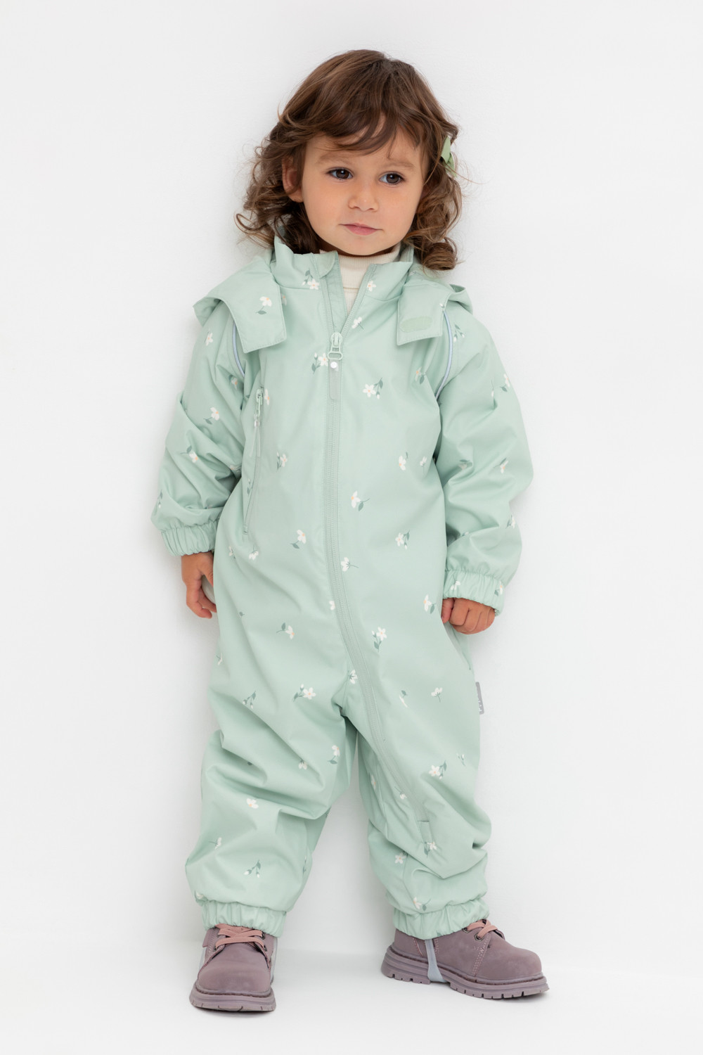Ветровочный комбинезон ясельный из мембранной ткани с дополнительной тефлоновой обработкой. Данный вид обработки предохраняет изделие от загрязнения и лучше отводит влагу. Подклад из 100% хлопка. У изделия удлиненная молния для легкого одевания с защитой подбородка. Утяжка на капюшоне с потайными стопперами. По низу рукавов и брючин, а также на спинке изделия эластичная резинка для лучшего прилегания. Для фиксации комбинезона используются съемные силиконовые штрипки. В размерах 68-80 функциональные отвороты на рукавах и брючинах. Во всех изделиях верхнего ассортимента для безопасности ребенка предусмотрены светоотражающие элементы.