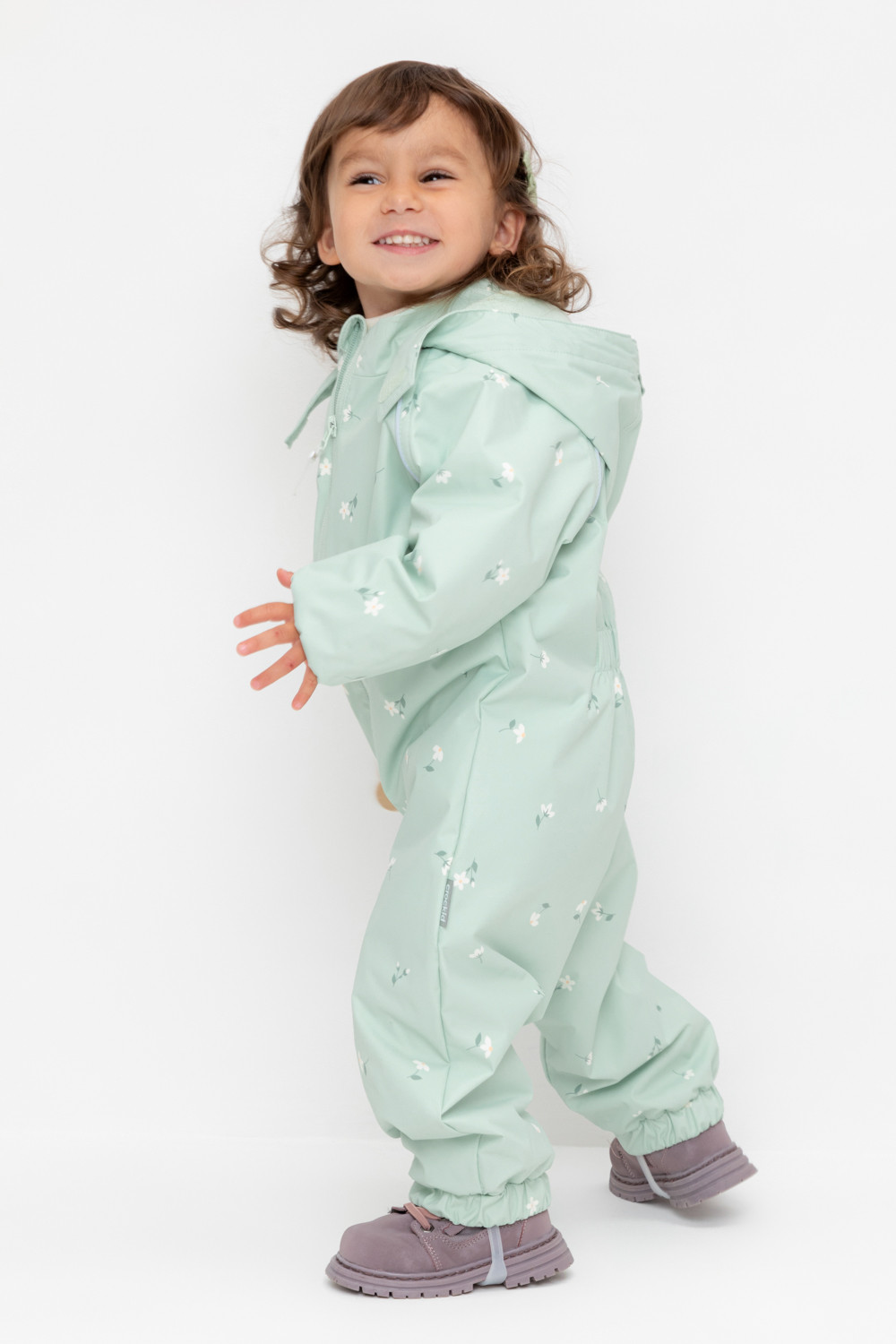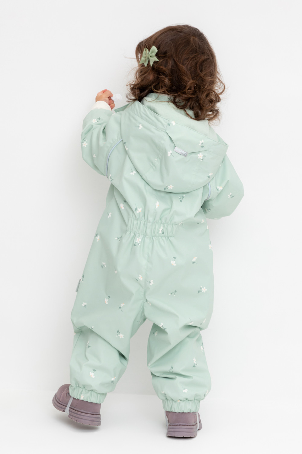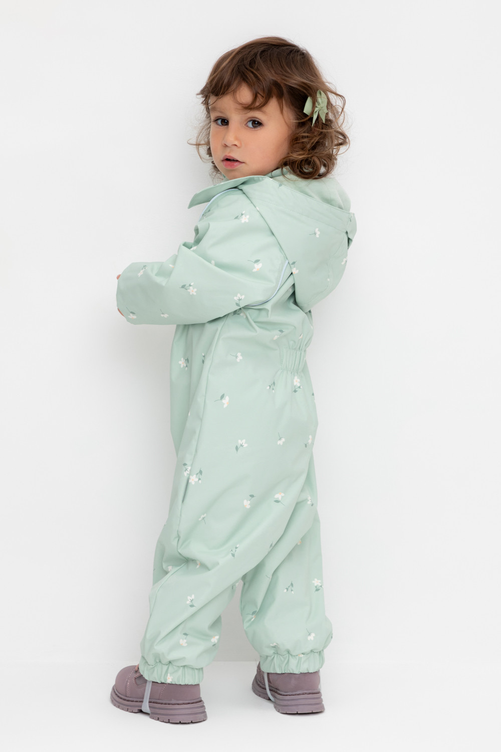 Ветровочный комбинезон ясельный из мембранной ткани с дополнительной тефлоновой обработкой. Данный вид обработки предохраняет изделие от загрязнения и лучше отводит влагу. Подклад из 100% хлопка. У изделия удлиненная молния для легкого одевания с защитой подбородка. Утяжка на капюшоне с потайными стопперами. По низу рукавов и брючин, а также на спинке изделия эластичная резинка для лучшего прилегания. Для фиксации комбинезона используются съемные силиконовые штрипки. В размерах 68-80 функциональные отвороты на рукавах и брючинах. Во всех изделиях верхнего ассортимента для безопасности ребенка предусмотрены светоотражающие элементы.