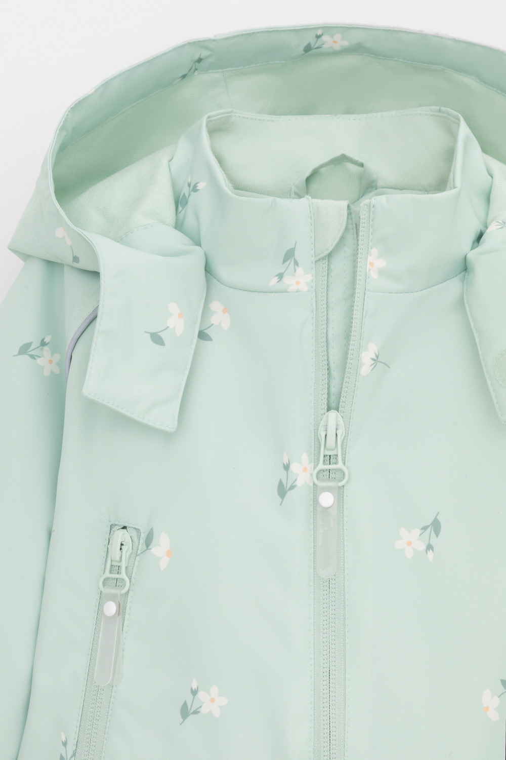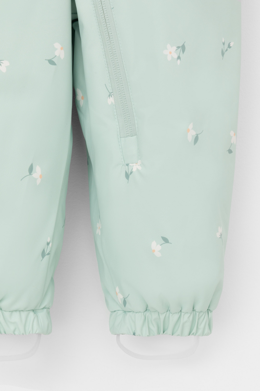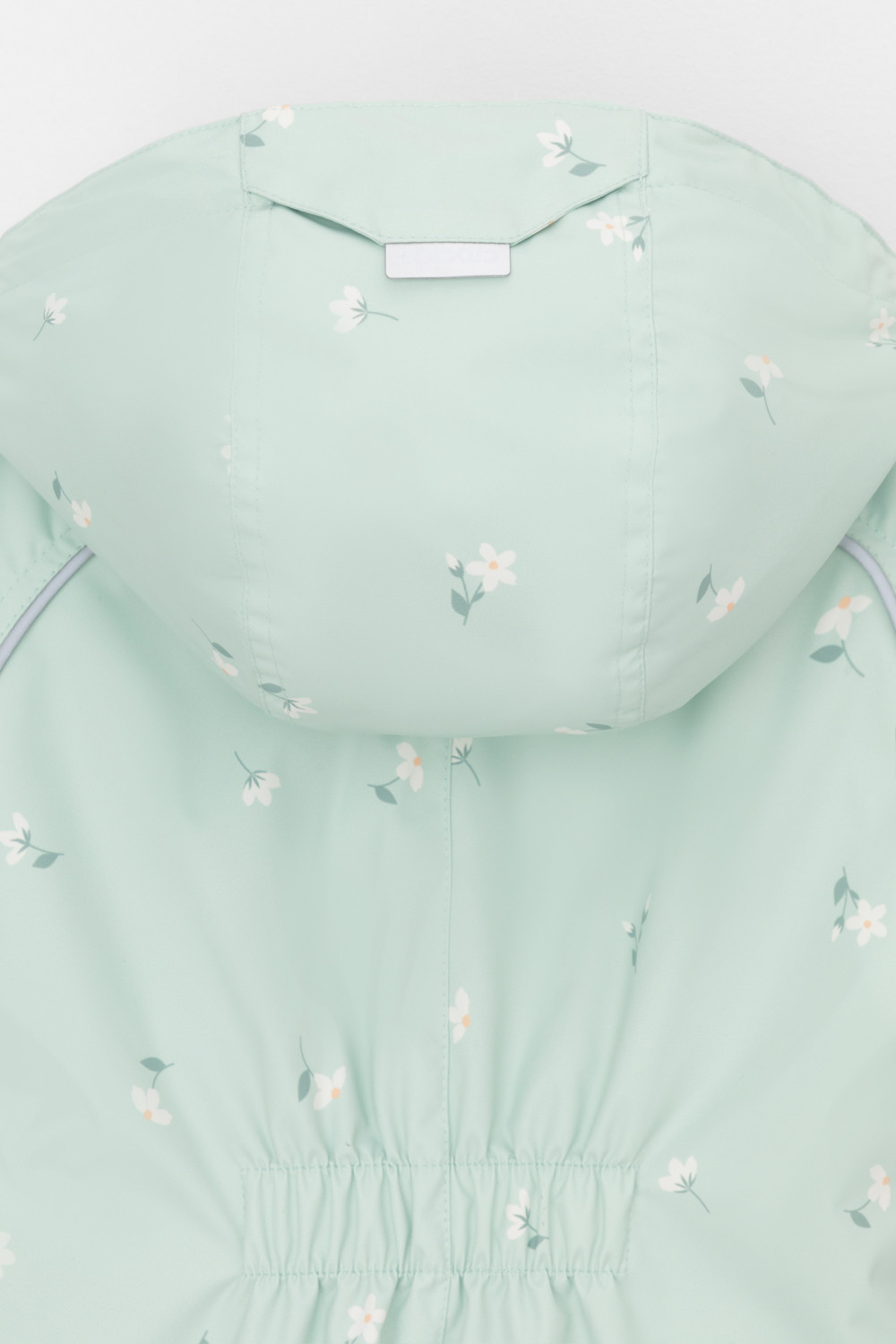 Ветровочный комбинезон ясельный из мембранной ткани с дополнительной тефлоновой обработкой. Данный вид обработки предохраняет изделие от загрязнения и лучше отводит влагу. Подклад из 100% хлопка. У изделия удлиненная молния для легкого одевания с защитой подбородка. Утяжка на капюшоне с потайными стопперами. По низу рукавов и брючин, а также на спинке изделия эластичная резинка для лучшего прилегания. Для фиксации комбинезона используются съемные силиконовые штрипки. В размерах 68-80 функциональные отвороты на рукавах и брючинах. Во всех изделиях верхнего ассортимента для безопасности ребенка предусмотрены светоотражающие элементы.