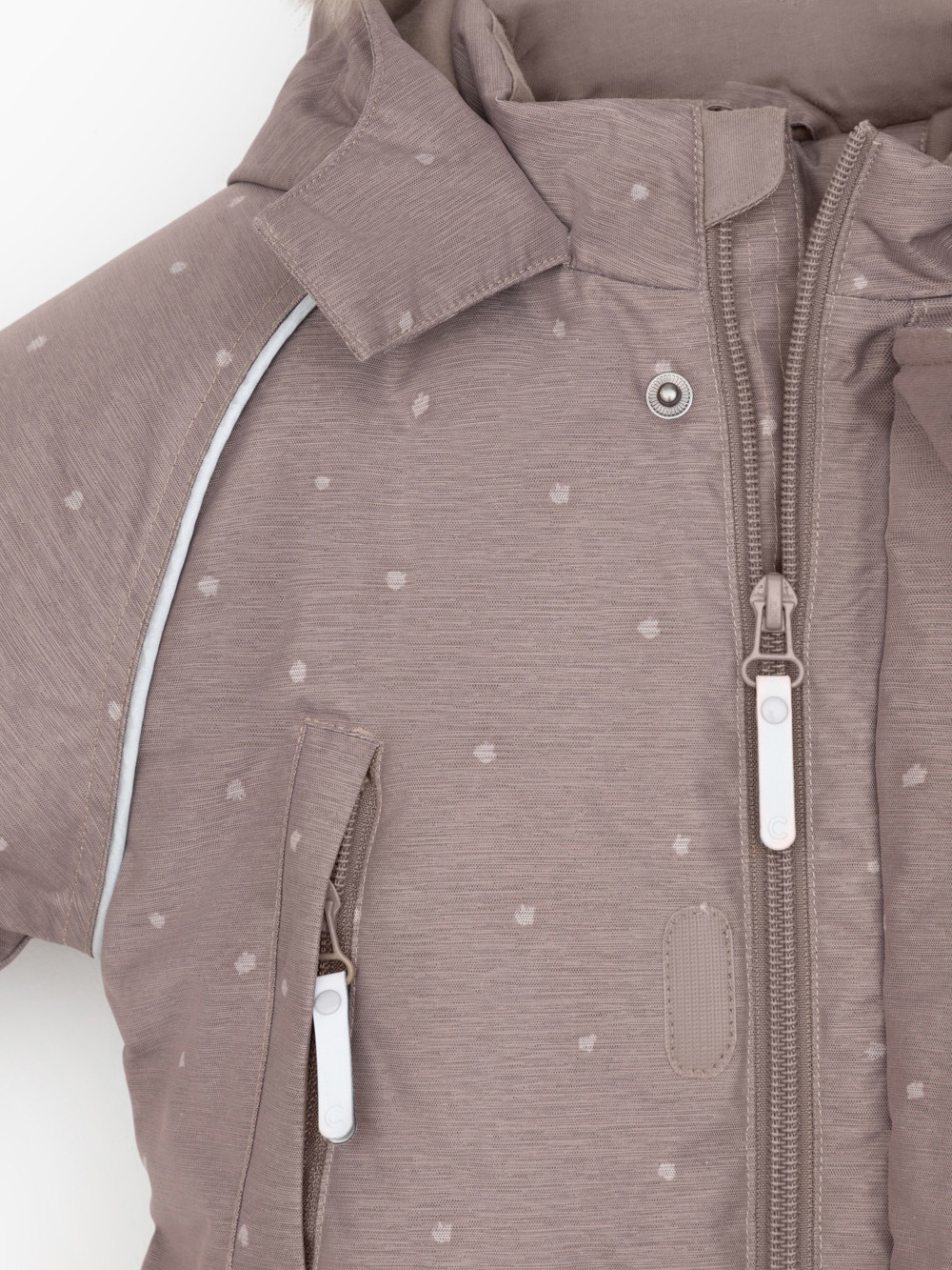 Зимний комбинезон ясельный с натуральным утеплителем из гусиного пуха (70%) и пера (30%). Выполнен из мембранной ткани с дополнительной тефлоновой обработкой, которая предохраняет изделие от загрязнений и отталкивает влагу. Подклад выполнен из 100% хлопка. Комбинезон застёгивается на молнию и внешнюю планку на липучках, предусмотрена защита подбородка. Несъёмный капюшон имеет эластичную утяжку со стопперами и отстёгивающийся мех на молнии. Резинка по спинке для лучшего прилегания. На груди карман на молнии. По рукавам и низу изделия эластичные манжеты, на ножках отстёгивающиеся силиконовые штрипки. В размерах с 68-74 по 80-86 в комплекте идут рукавицы и пинетки. Во всех изделиях верхнего ассортимента для безопасности ребёнка предусмотрены светоотражающие элементы.