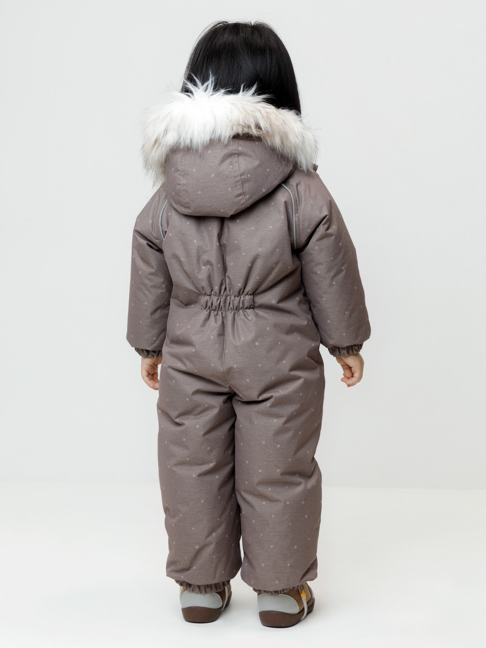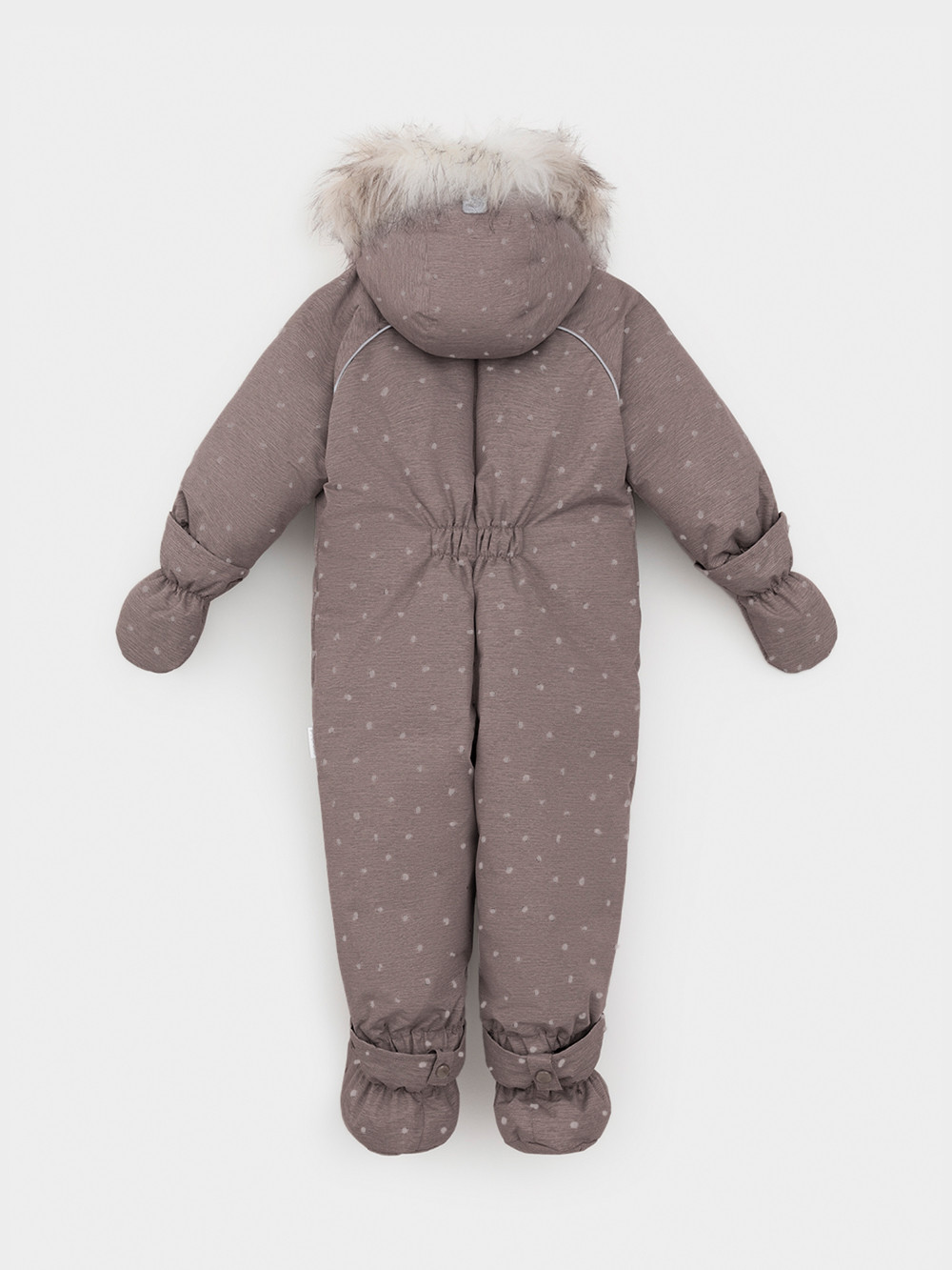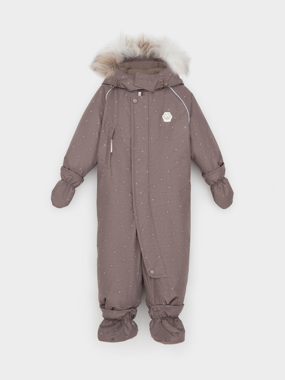 Зимний комбинезон ясельный с натуральным утеплителем из гусиного пуха (70%) и пера (30%). Выполнен из мембранной ткани с дополнительной тефлоновой обработкой, которая предохраняет изделие от загрязнений и отталкивает влагу. Подклад выполнен из 100% хлопка. Комбинезон застёгивается на молнию и внешнюю планку на липучках, предусмотрена защита подбородка. Несъёмный капюшон имеет эластичную утяжку со стопперами и отстёгивающийся мех на молнии. Резинка по спинке для лучшего прилегания. На груди карман на молнии. По рукавам и низу изделия эластичные манжеты, на ножках отстёгивающиеся силиконовые штрипки. В размерах с 68-74 по 80-86 в комплекте идут рукавицы и пинетки. Во всех изделиях верхнего ассортимента для безопасности ребёнка предусмотрены светоотражающие элементы.