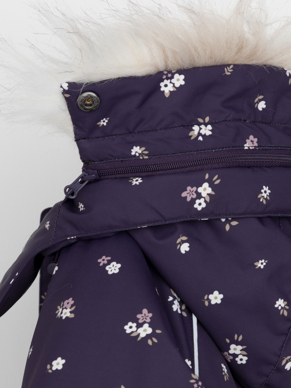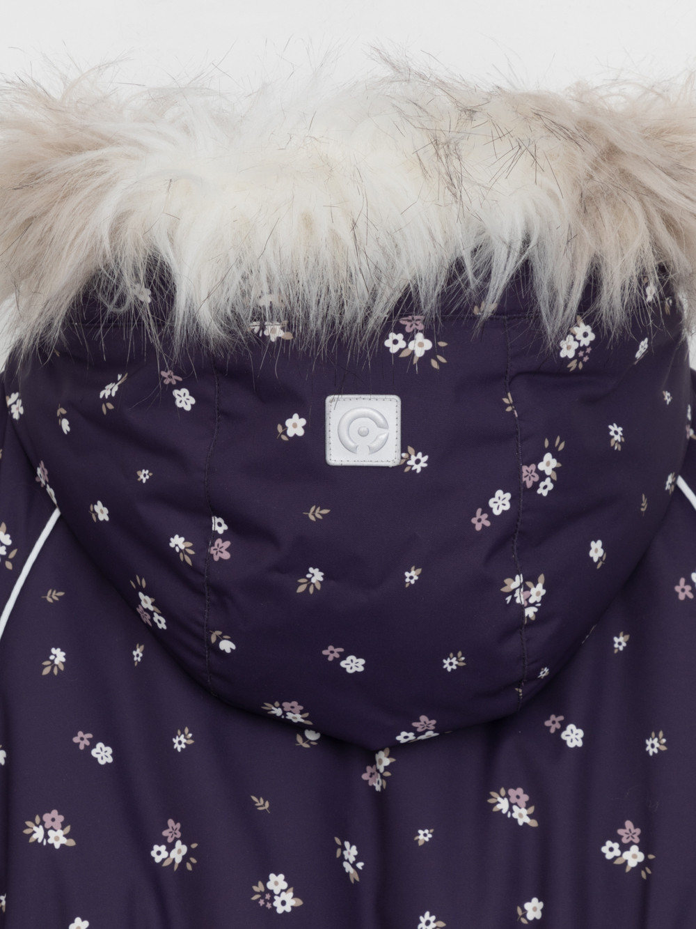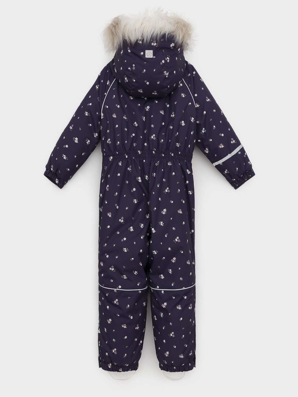 Зимний комбинезон для девочки с утеплителем Fellex®: 250 г/м2 . Выполнен из мембранной ткани с дополнительной тефлоновой обработкой, которая предохраняет изделие от загрязнений и отталкивает влагу. Подклад выполнен из 100% полиэстера Tricot. Комбинезон застёгивается на молнию и внешнюю планку на липучках и кнопках, предусмотрена защита подбородка. Съёмный капюшон имеет эластичную утяжку со стопперами и отстёгивающийся искусственный мех. Резинка по спинке обеспечивает лучшее прилегание. По бокам два кармана на молнии. Эластичные манжеты на рукавах  регулируются по ширине с помощью липучки, по низу изделия - с помощью кнопки. Внутренняя противоснежная юбка защищает обувь от попадания снега и удерживает комбинезон в закреплённом положении, предусмотрены отстёгивающиеся штрипки. Во всех изделиях верхнего ассортимента для безопасности ребёнка предусмотрены светоотражающие элементы.