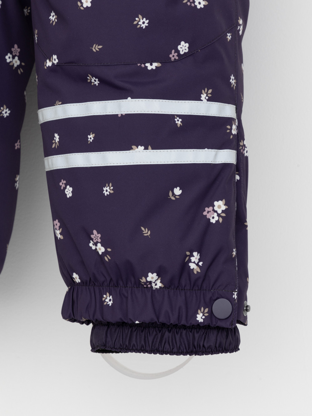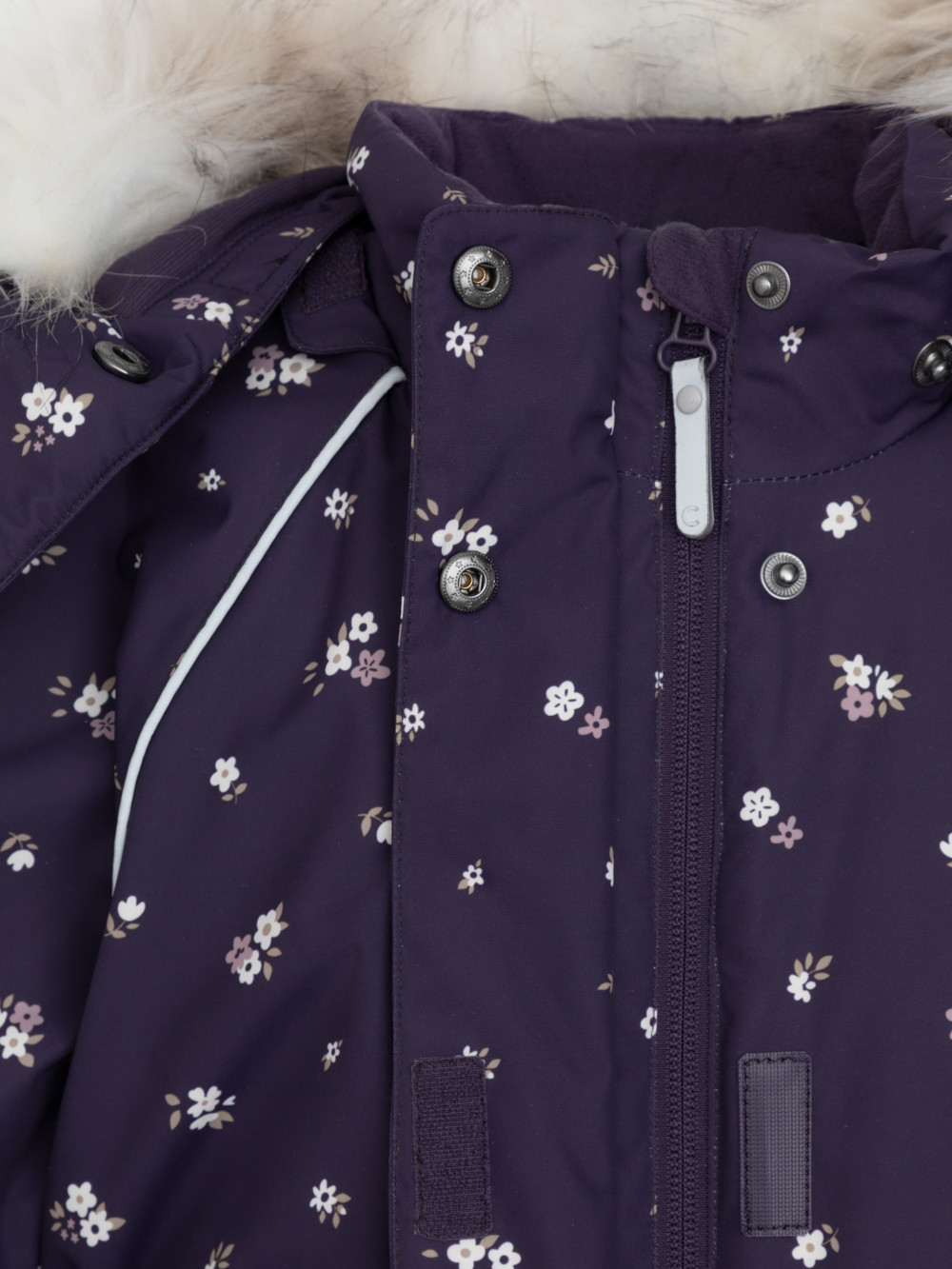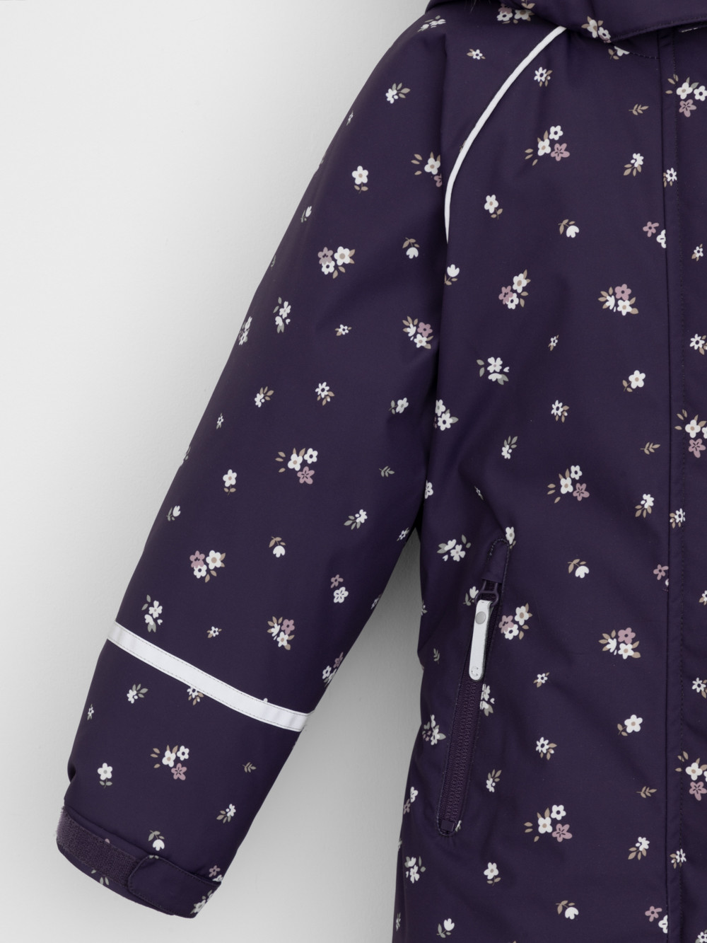 Зимний комбинезон для девочки с утеплителем Fellex®: 250 г/м2 . Выполнен из мембранной ткани с дополнительной тефлоновой обработкой, которая предохраняет изделие от загрязнений и отталкивает влагу. Подклад выполнен из 100% полиэстера Tricot. Комбинезон застёгивается на молнию и внешнюю планку на липучках и кнопках, предусмотрена защита подбородка. Съёмный капюшон имеет эластичную утяжку со стопперами и отстёгивающийся искусственный мех. Резинка по спинке обеспечивает лучшее прилегание. По бокам два кармана на молнии. Эластичные манжеты на рукавах  регулируются по ширине с помощью липучки, по низу изделия - с помощью кнопки. Внутренняя противоснежная юбка защищает обувь от попадания снега и удерживает комбинезон в закреплённом положении, предусмотрены отстёгивающиеся штрипки. Во всех изделиях верхнего ассортимента для безопасности ребёнка предусмотрены светоотражающие элементы.