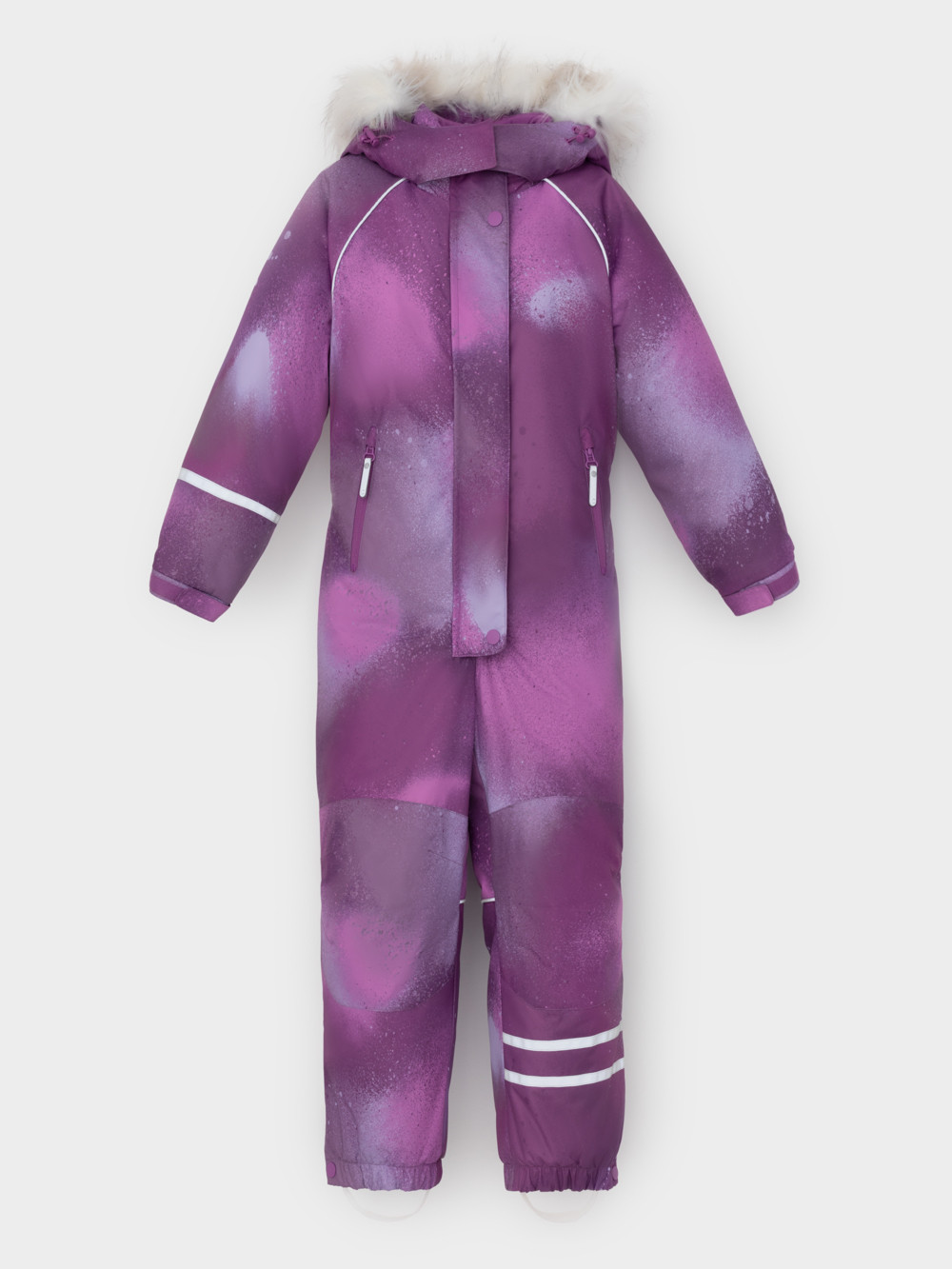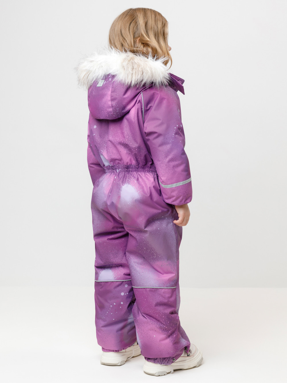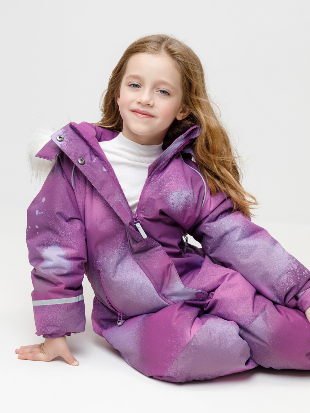 Зимний комбинезон для девочки с утеплителем Fellex®: 250 г/м2 . Выполнен из мембранной ткани с дополнительной тефлоновой обработкой, которая предохраняет изделие от загрязнений и отталкивает влагу. Подклад выполнен из 100% полиэстера Tricot. Комбинезон застёгивается на молнию и внешнюю планку на липучках и кнопках, предусмотрена защита подбородка. Съёмный капюшон имеет эластичную утяжку со стопперами и отстёгивающийся искусственный мех. Резинка по спинке обеспечивает лучшее прилегание. По бокам два кармана на молнии. Эластичные манжеты на рукавах  регулируются по ширине с помощью липучки, по низу изделия - с помощью кнопки. Внутренняя противоснежная юбка защищает обувь от попадания снега и удерживает комбинезон в закреплённом положении, предусмотрены отстёгивающиеся штрипки. Во всех изделиях верхнего ассортимента для безопасности ребёнка предусмотрены светоотражающие элементы.